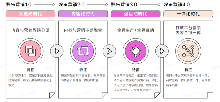 电视台插播、明星代言、影视剧植入、综艺品牌冠名……传统的娱乐营销形式至今仍有广泛市场,但用户和品牌方的需求其实正在随时代悄然改变。 早期以电视广告为代表的娱乐营销特征是内容与营销界限分明,随着网络媒体兴起,定制化内容潮流出现,营销逐渐与内容融合为一体,但这两个阶段的共同点是用户基本处于被动接受信息的状态。 直至移动互联网时代来临、短视频平台崛起为国民级基础应用后,全民参与内容生产、互动的新现象成为了新的常态。这既为娱乐营销带来了直接触达用户的机遇和海量的娱乐营销新玩法,也从另一方面改变了娱乐营销的“土壤”,媒体技术日渐发达后,娱乐内容产量大增,同时用户的消费决策链条也大大缩短了,品牌不再满足于曝光,而希望看到更直接的数据和销量转化。 这逐渐产生了新的行业痛点:如何在内容生产方面与用户同频率?如何在同一平台内高效完成种草乃至购买转化?如何确实有效地评估投放效果? 对此《白皮书》中指出,娱乐营销在当下已经步入了4.0阶段,“一体化”是这一阶段的显著特征——对品牌主而言,让消费者在同一平台省时快捷地完成整个购物体验能有效帮助品牌提升转化效率。在2022CMO营销调研中,有9成的CMO认为品效销一体化是2022年营销的重要方向。