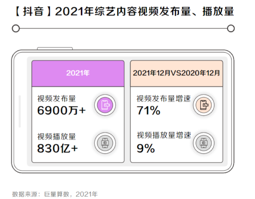 综艺内容是抖音用户关注度上升显著的类别,2021年综艺兴趣用户同比增长达到36%。其中抖音和浙江卫视联合出品的优质综艺《为歌而赞》在电视台、短视频两端成绩斐然,CSM平均收视率2.29,持续保持在同时段卫视综艺收视率TOP3;巨量算数数据显示,抖音平台节目长短视频播放量超过161亿。