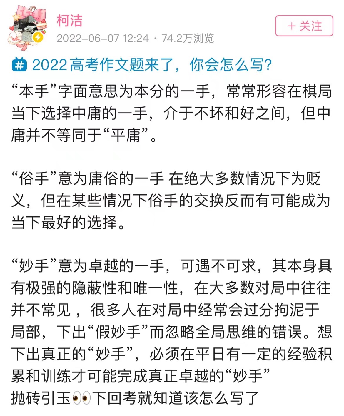 在全国新高考Ⅰ卷的作文题中,出现了“本手、妙手、俗手”这三个围棋术语。