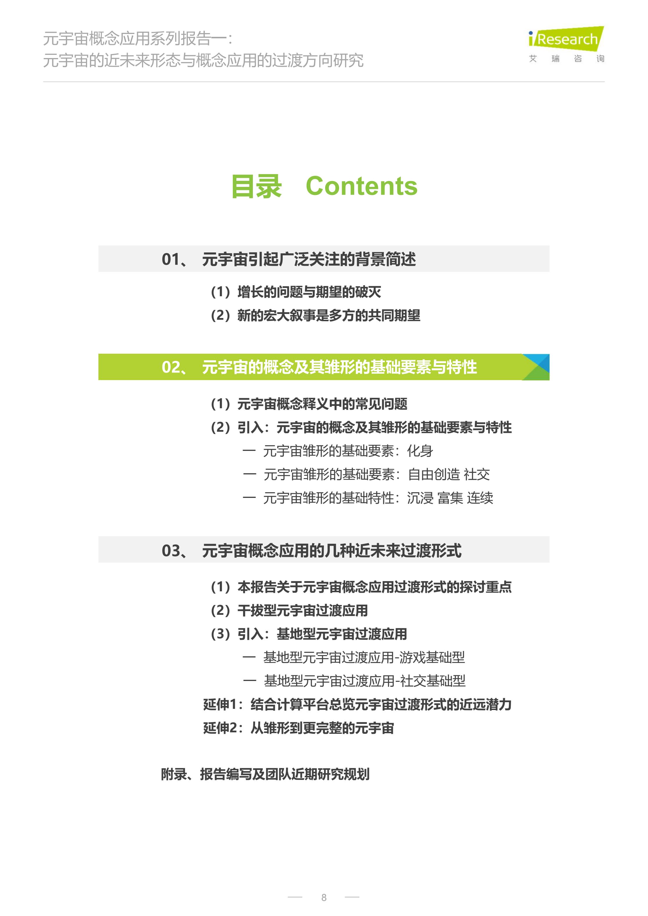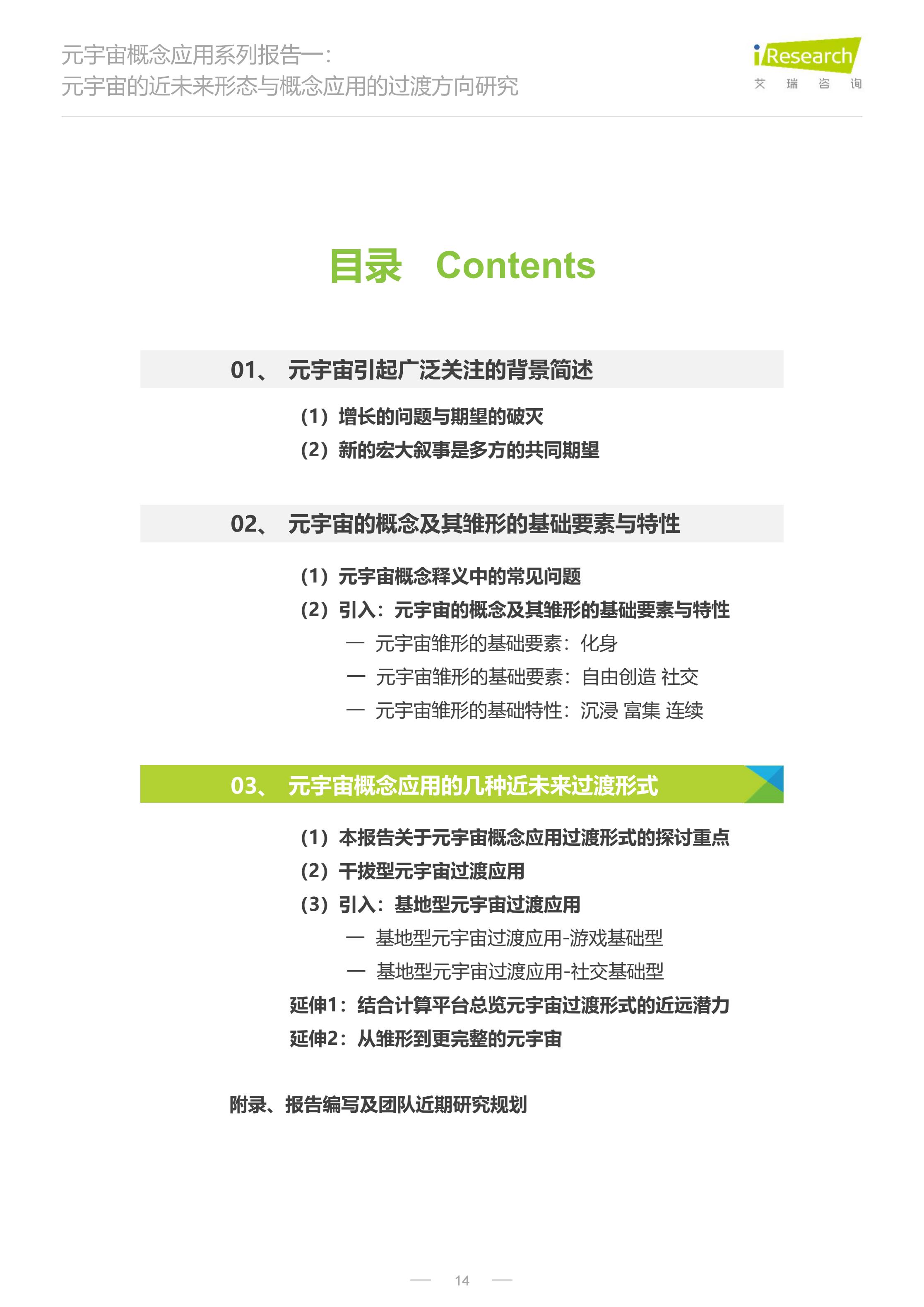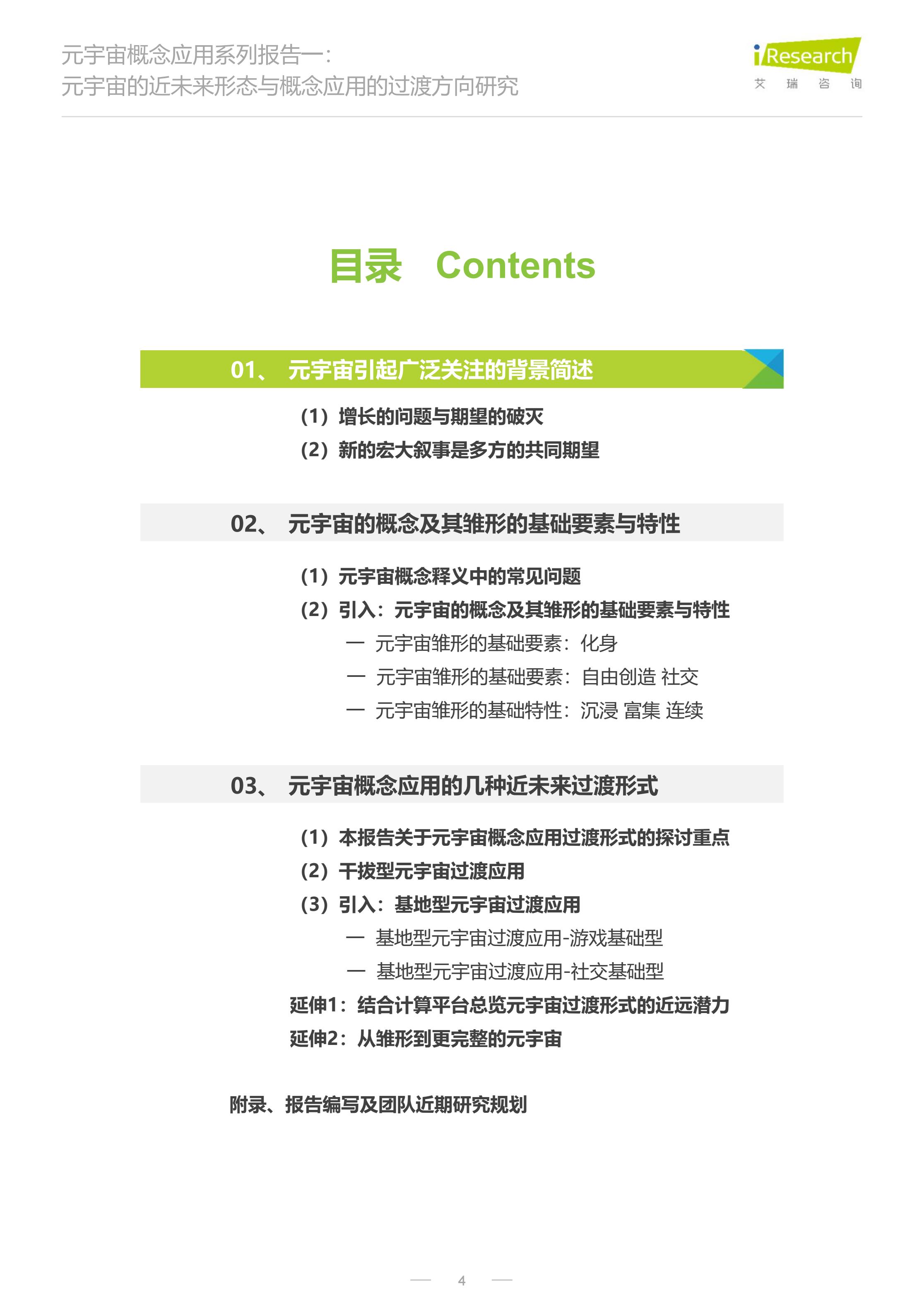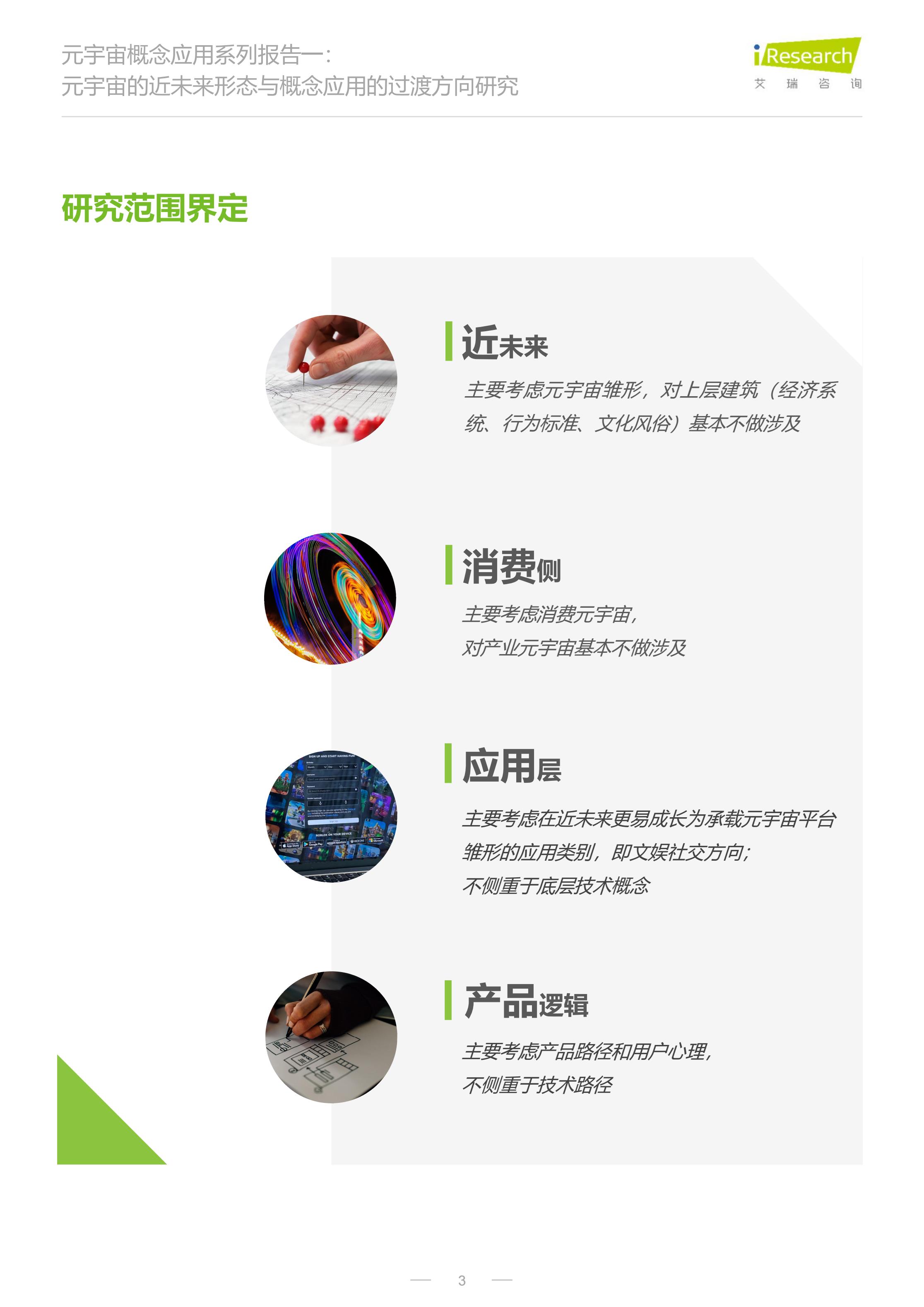 本报告是元宇宙概念应用系列报告的首篇,主要围绕近未来、消费侧、应用层、产品逻辑展开讨论,内容主要涉及4个方面: