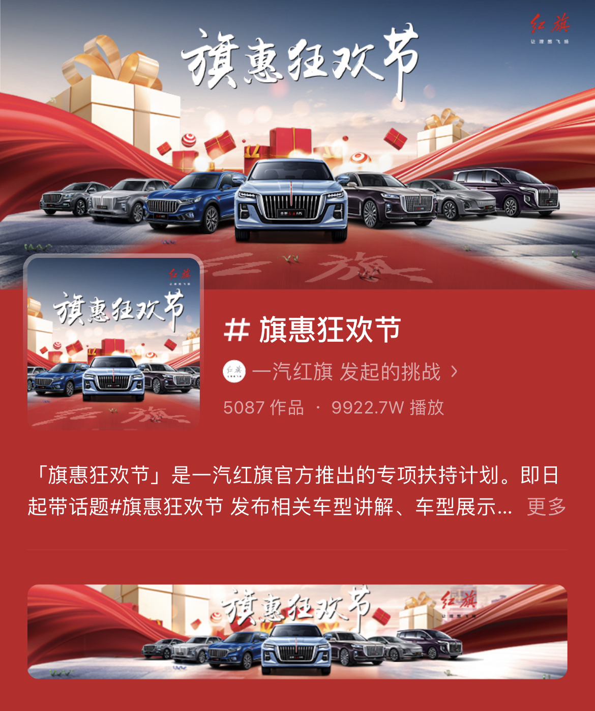 一汽红旗及其经销商矩阵账号,借力“快意计划”,在深耕短视频及直播平台的战略布局下,成功将公域流量的触达进行沉淀、进而转化为红旗私域资产。