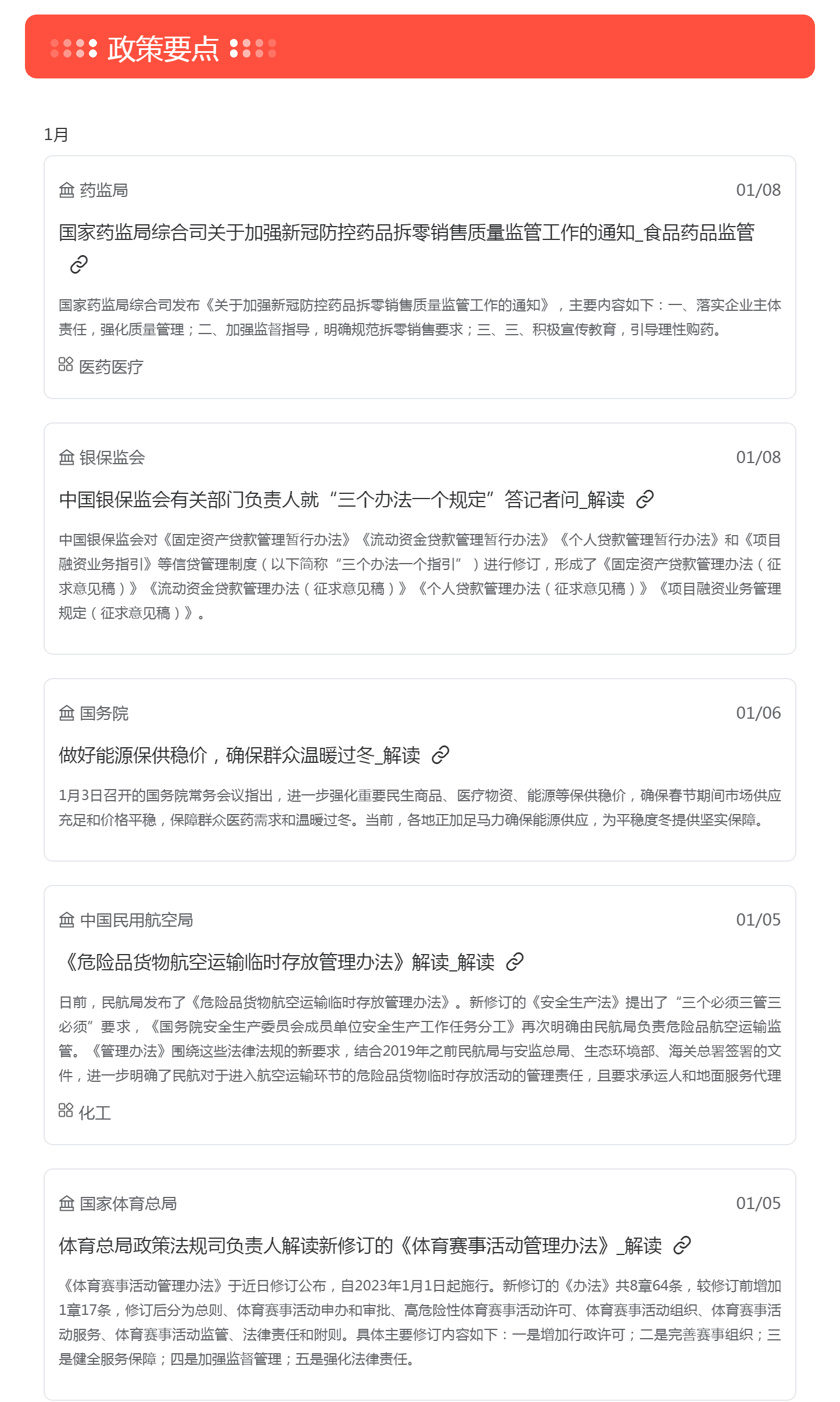 根据梅花数据要政盘点统计,上周共收录重要政策信息共计99条,其中涉及医疗、金融、物流等多个领域,建议重点关注《关于加强新冠防控药品拆零销售质量监管工作的通知》、《“三个办法一个规定”答记者问》、《“十四五”现代物流发展规划》等政策。