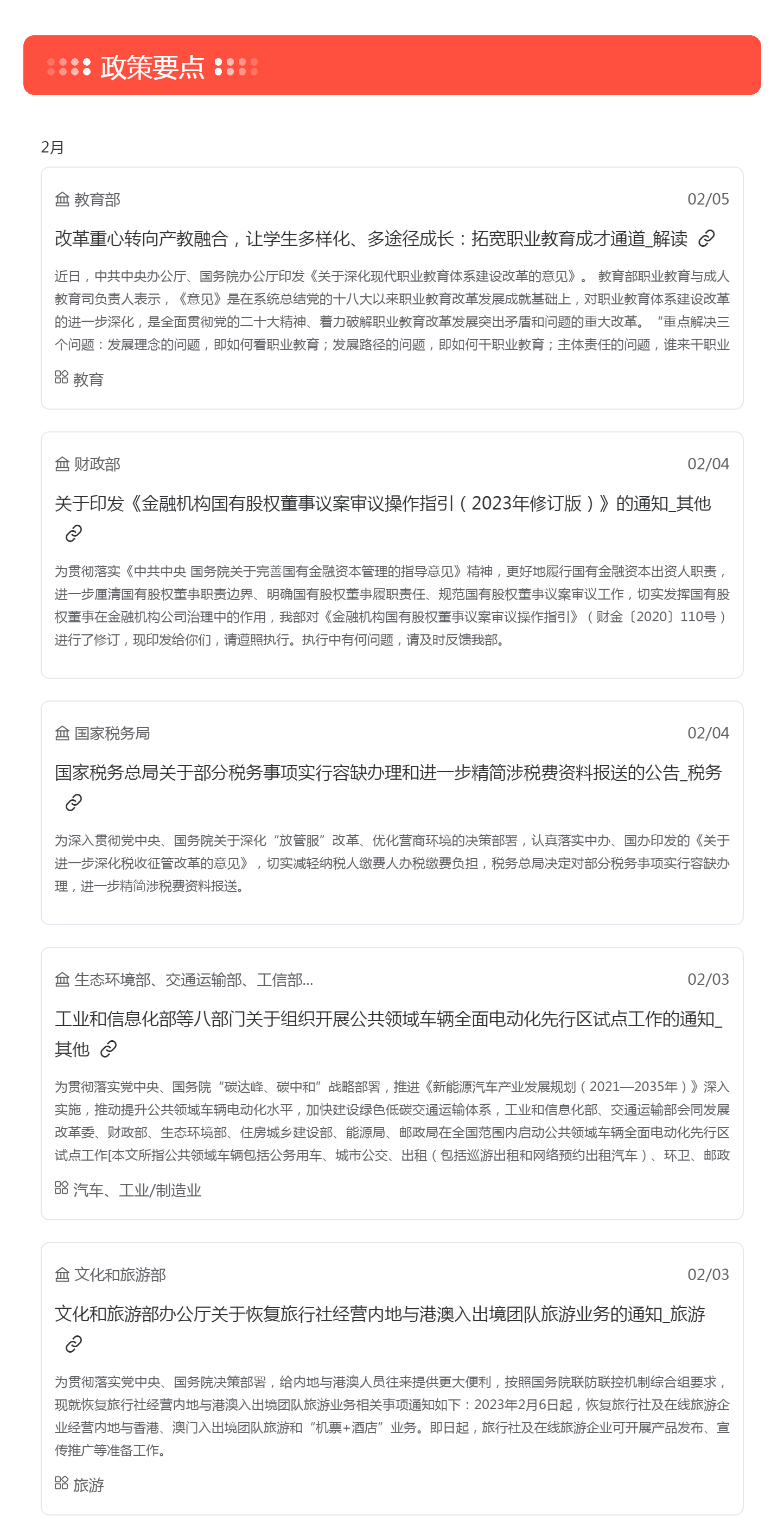根据梅花数据要政盘点统计,上周共收录重要政策信息共计109条,其中涉及教育、金融、医疗等多个领域,建议重点关注《关于深化现代职业教育体系建设改革的意见》、《支持国有企业办医疗机构高质量发展工作方案》等政策。