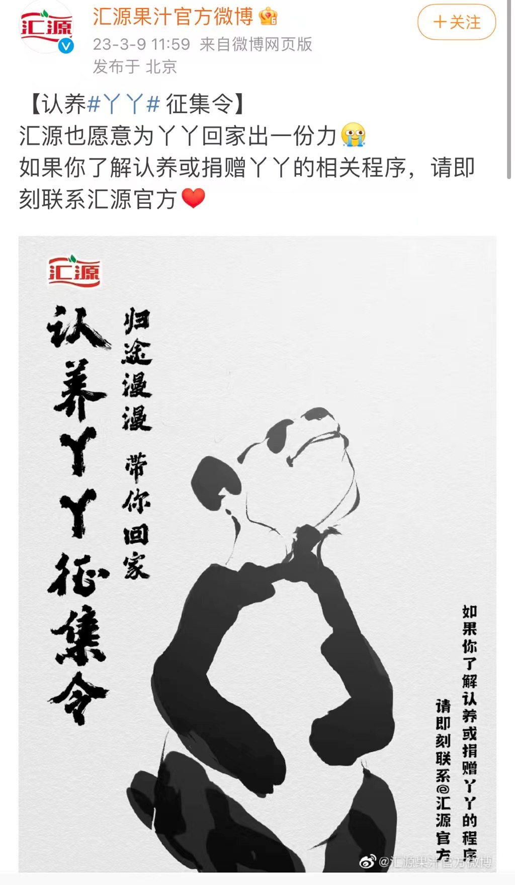 3月9日中午,汇源在官博向网友征集认养或向丫丫捐赠的相关程序。