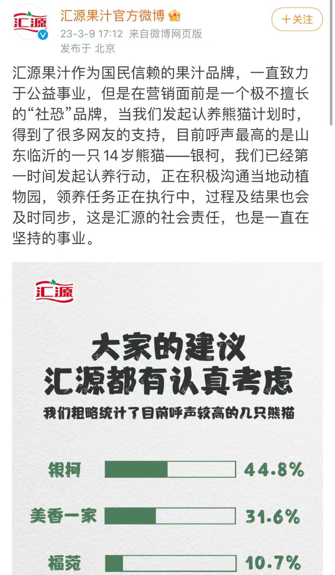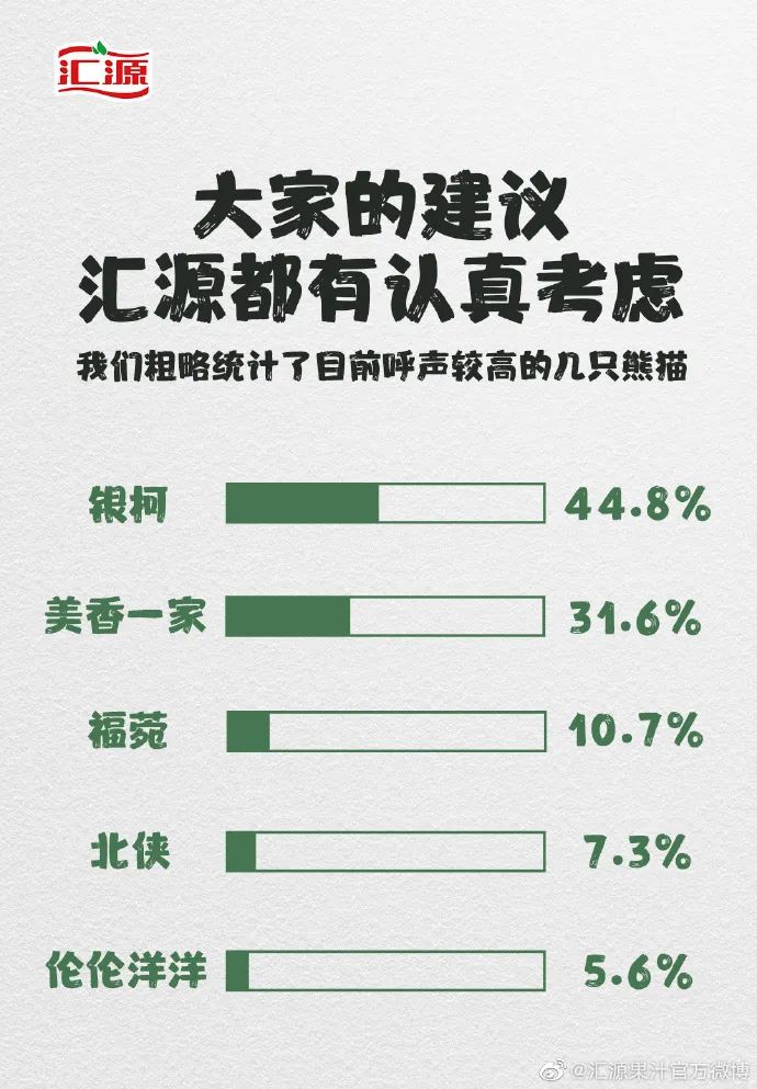 好在当天下午5点多,汇源非常速度地公布了统计下来,网友认养呼声较高的大熊猫。