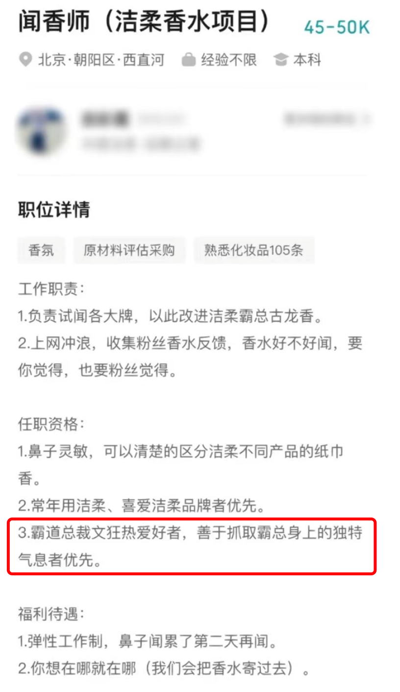 上周,洁柔的一则招聘火出圈。其中提到的“霸总古龙香”,与洁柔品牌下的某一款面纸味道相同,是应粉丝呼声推出的香水,也是企业周年限定香水。洁柔要求应聘者是霸道总裁文狂热爱好者。
