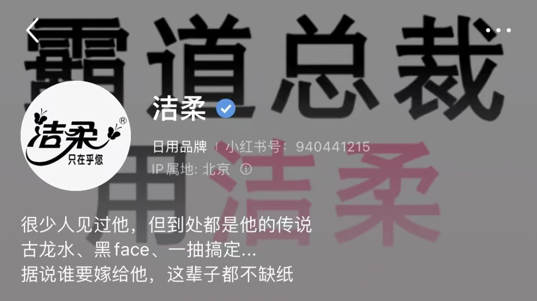 背景图里,霸道总裁用洁柔,简介里,洁柔是霸总,你可能会觉得这有点偷换概念。但洁柔对霸总人设的内化是成功的。