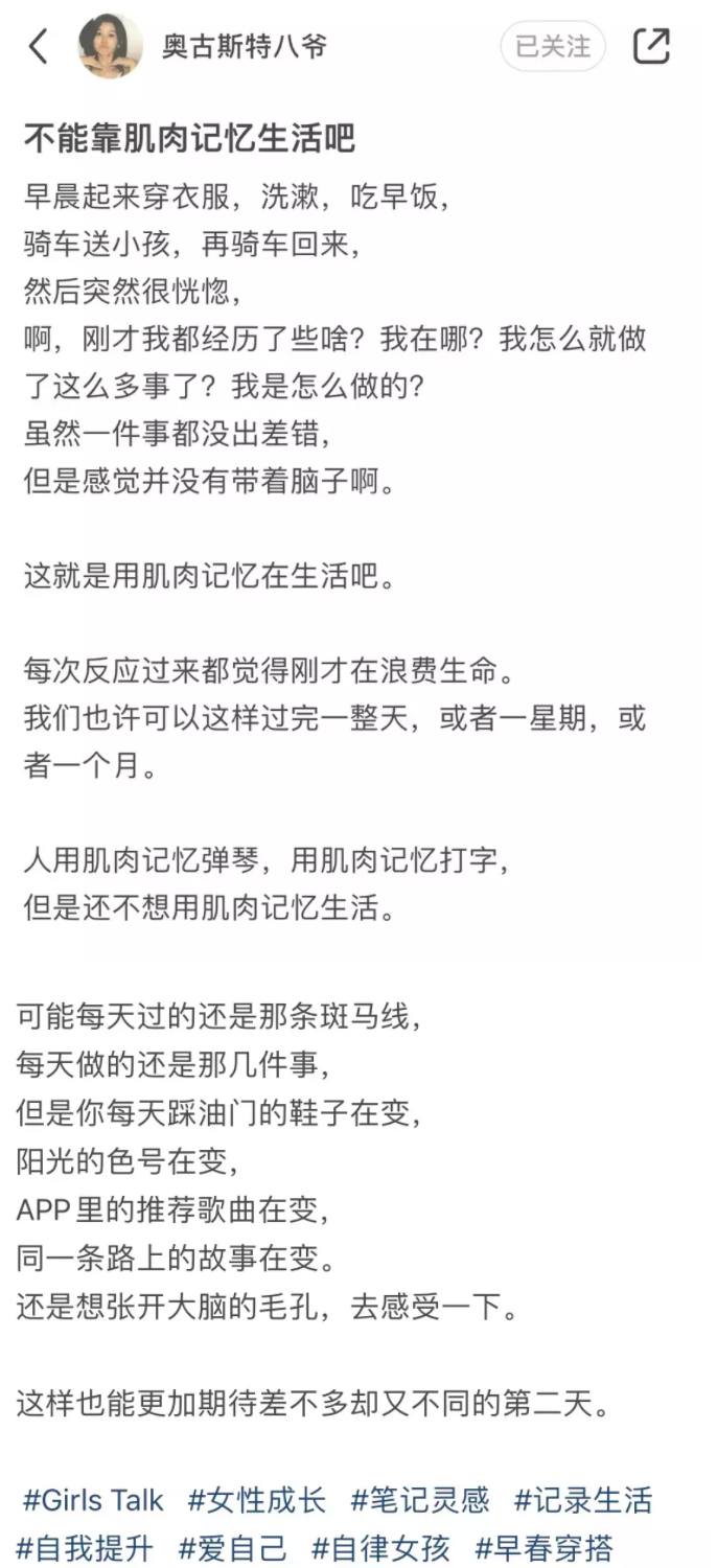《重启今日》讨论的是“如何过好日复一日的工作生活”。小编在刷小红书时,看到了广告人@奥古斯特八爷 的一条类似主题的小红书帖子《不能靠肌肉记忆生活吧》。