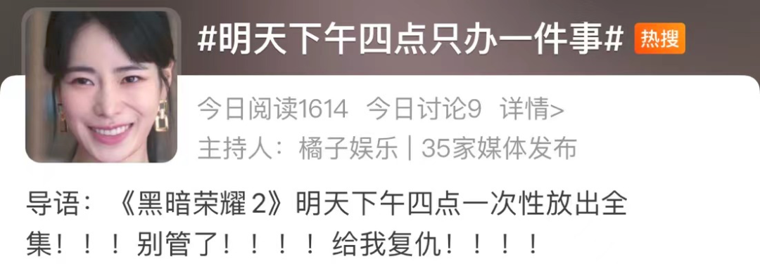 韩剧《黑暗荣耀》第二季还未上线,就先火上了微博热搜。网友们对女主的下半段复仇故事期待度爆表。