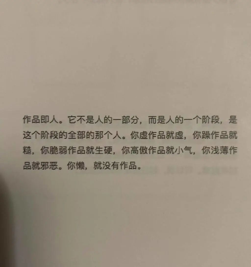 作品即人。它不是人的一部分,而是人的一个阶段,是这个阶段的全部的那个人。你虚作品就虚,你躁作品就糙,你脆弱作品就生硬,你高傲作品就小气,你浅薄作品就邪恶。你懒,就没有作品。