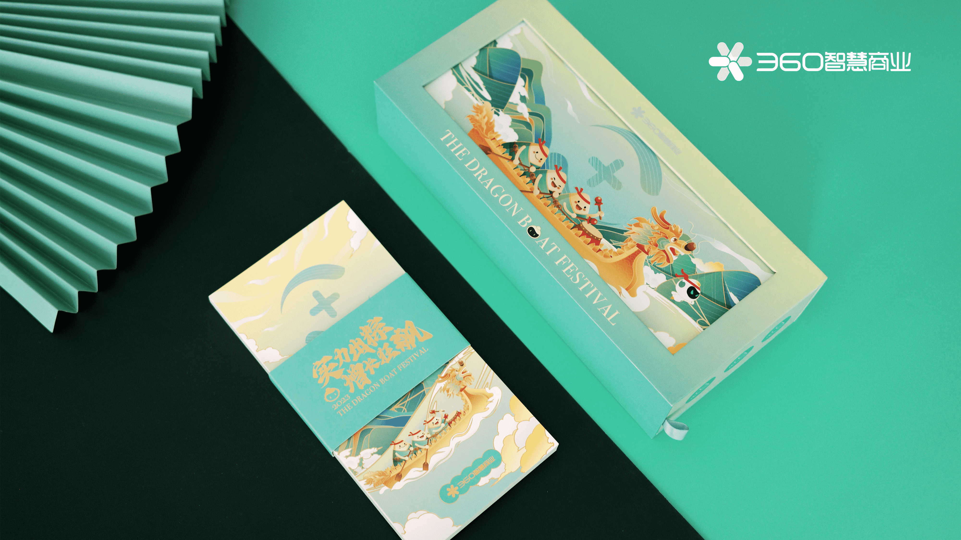 360智慧商业的端午礼盒以“龙舟”、“中国风”、“小安IP形象”等元素为主要创意元素。整体采用烫金工艺处理,有“实力出粽”的寓意。