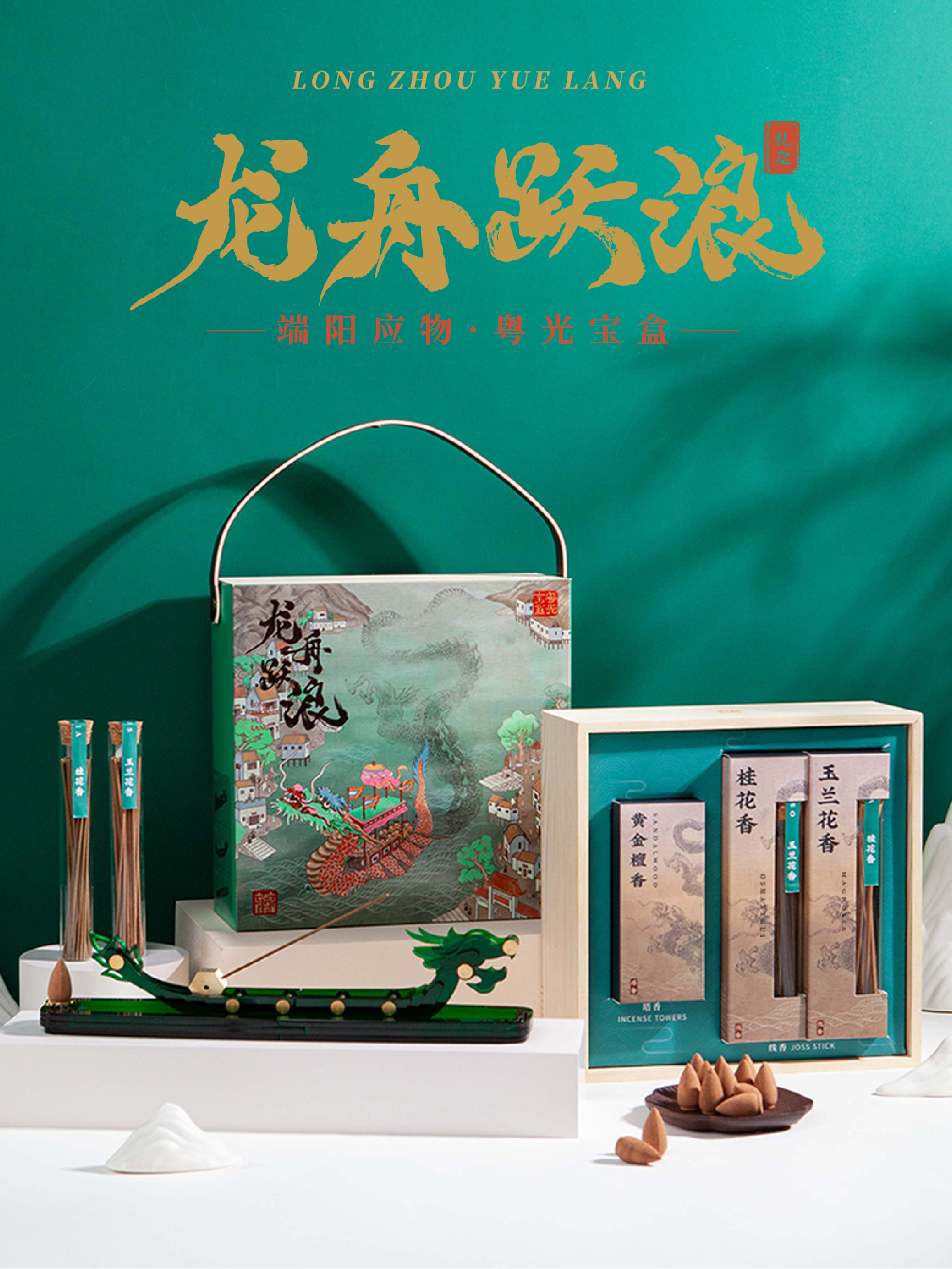 “龙舟跃浪”礼盒灵感来自广东省博物馆馆藏(南宋)陈容《墨龙图》轴。在设计师的笔下,沉睡于画中的墨龙跃纸而出,化龙成舟,驰骋江上。