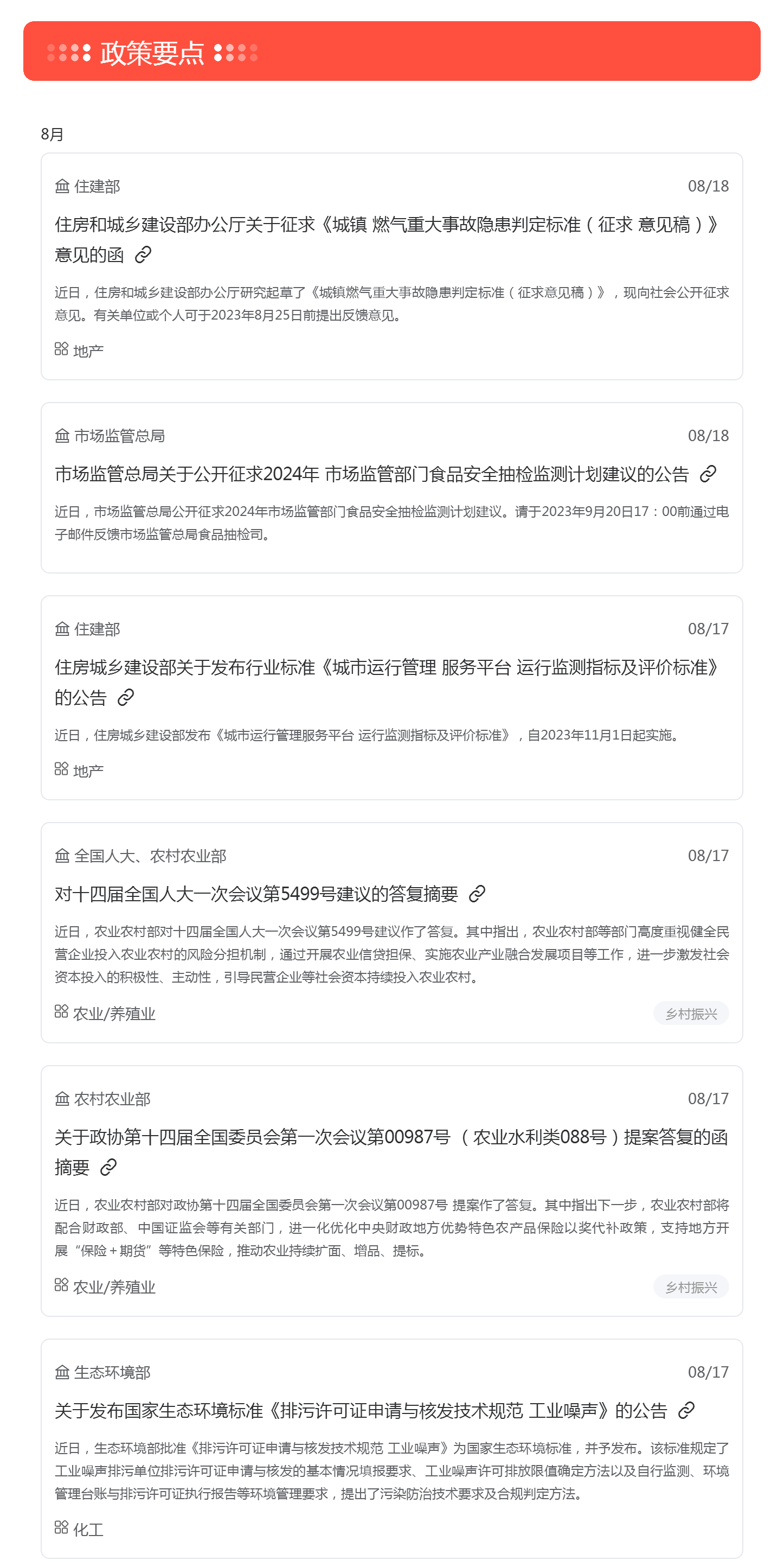 根据梅花数据舆情监测要政盘点统计,上周共收录重要政策信息共计73条,其中涉及地产、农业/养殖业、化工等多个领域,建议重点关注《排污许可证申请与核发技术规范 工业噪声》、《关于调整海南自由贸易港交通工具及游艇“零关税” 政策的通知》等政策。