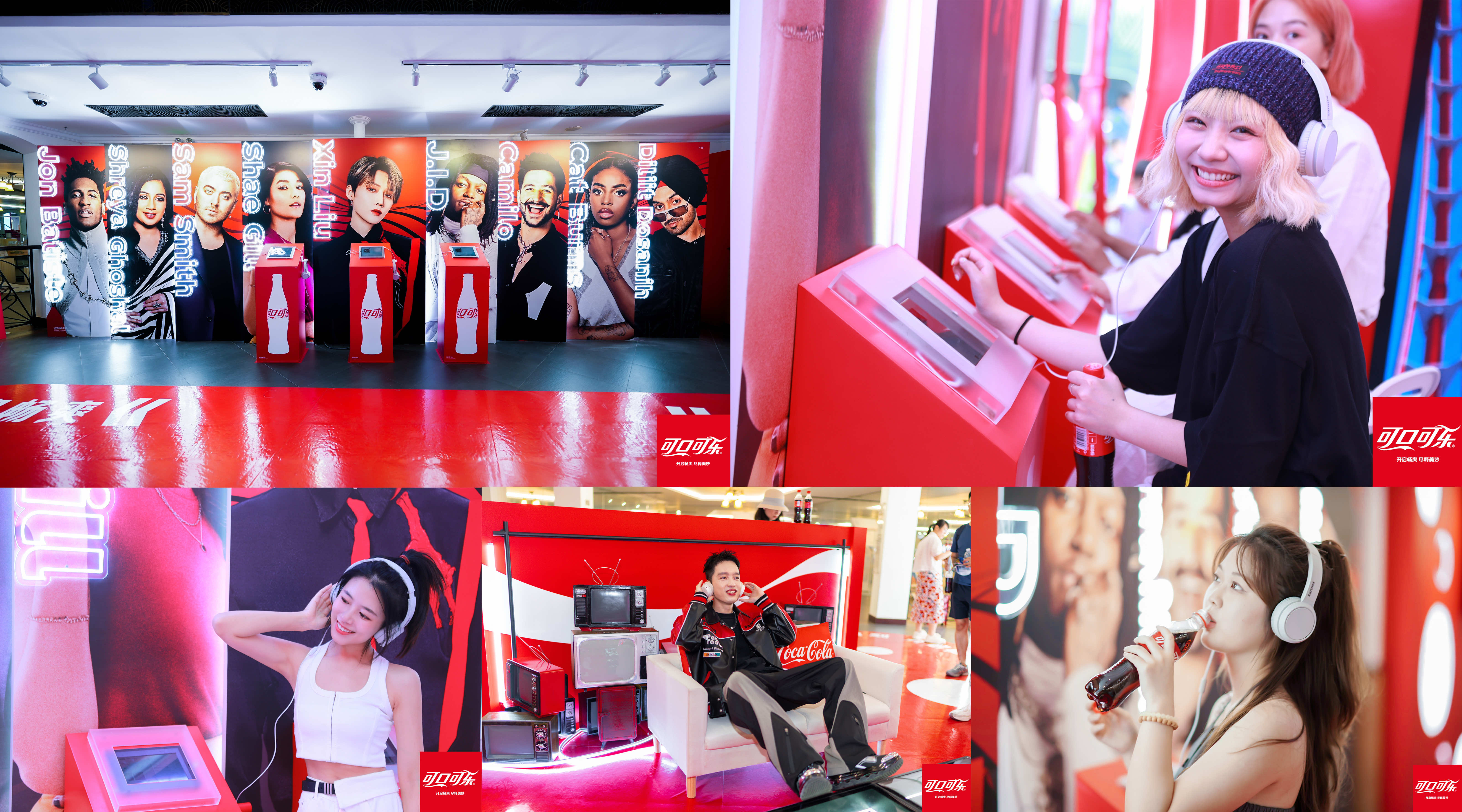 漫步一侧的可口可乐畅爽音棚展示区,参观者则可以戴上耳机,随机点播可口可乐众多签约艺人的创作歌曲,感受畅爽音浪带来的极致听觉盛宴,尽情释放快乐多巴胺。