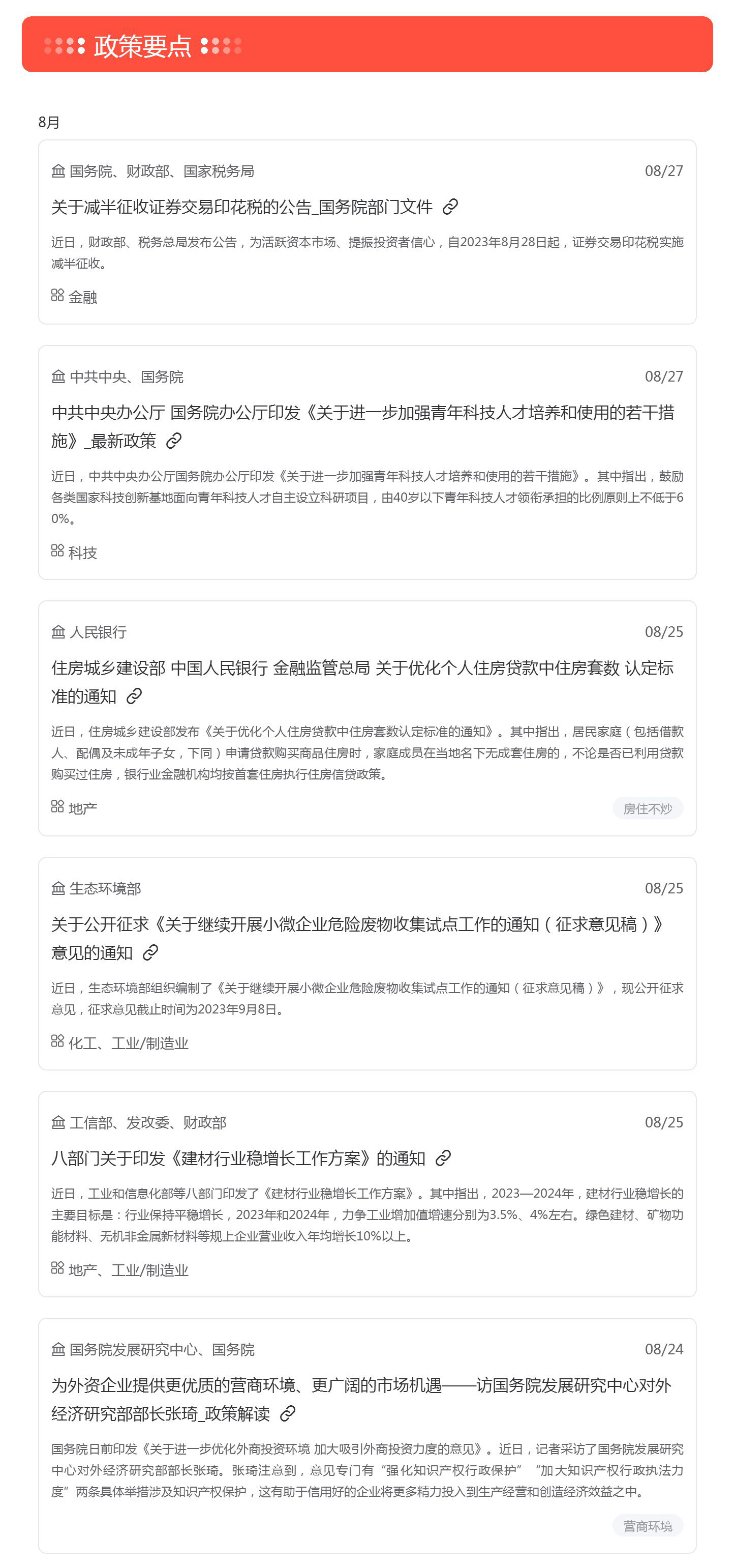 根据梅花数据舆情监测要政盘点统计,上周共收录重要政策信息共计92条,其中涉及环监环保与治理、农林牧渔水、国土资源/能源等多个领域,建议重点关注《关于减半征收证券交易印花税的公告》、《建材行业稳增长工作方案》、《绿色低碳先进技术示范工程实施方案》等政策。