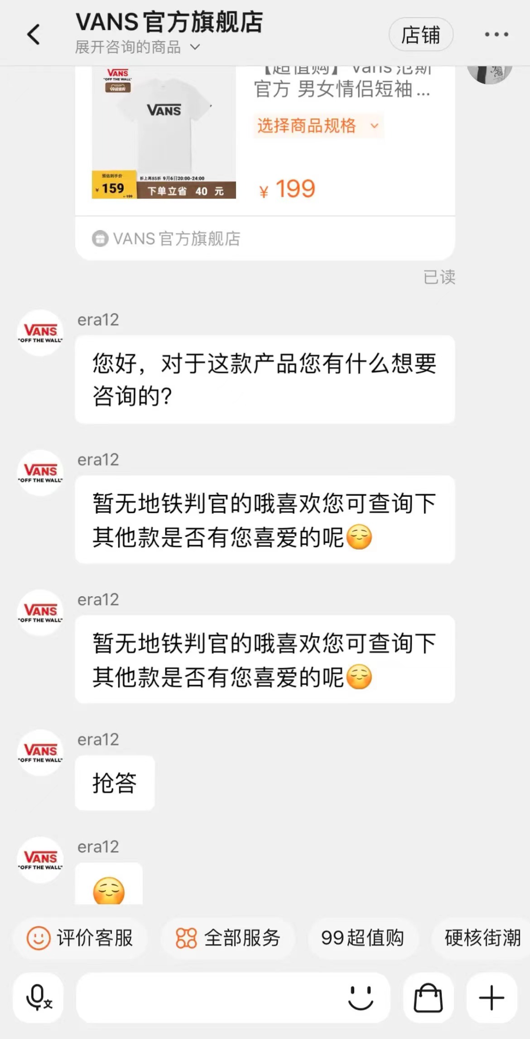 问同款的人太多,VANS官方旗舰店的客服都学会抢答了