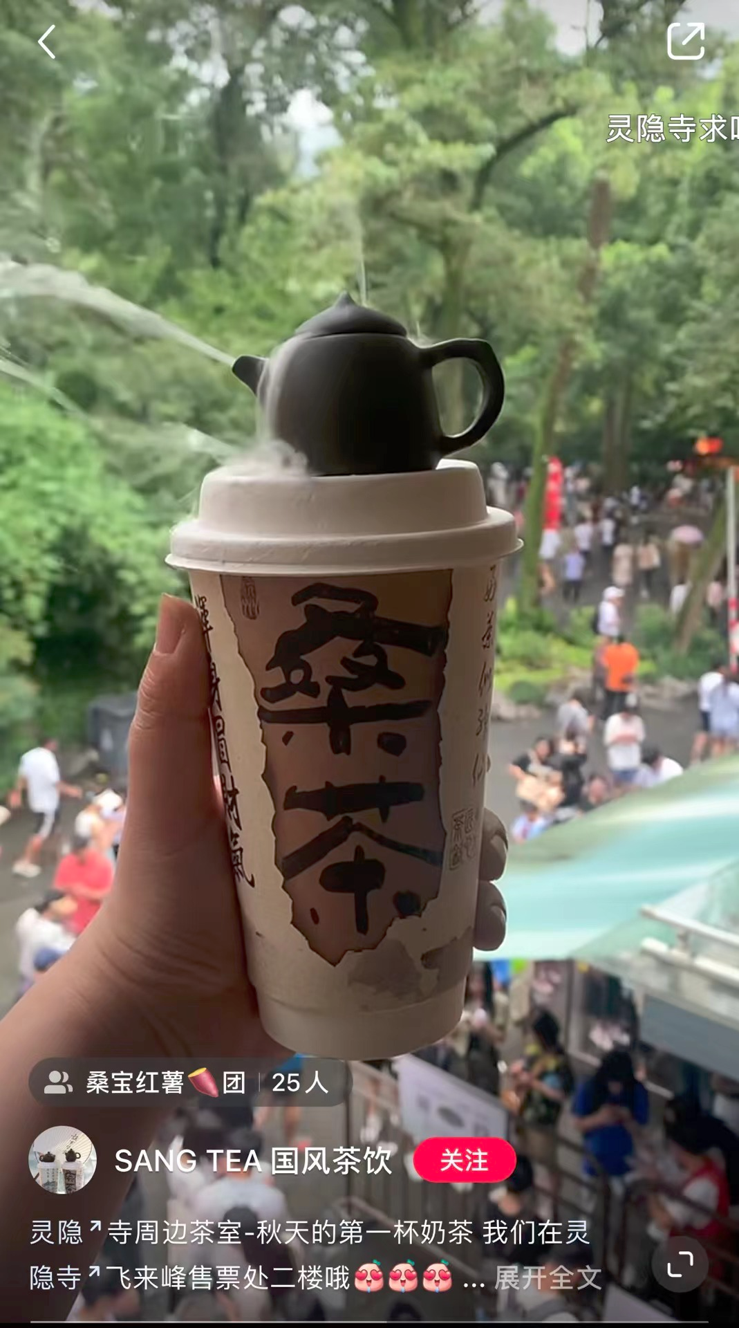 奶茶品牌叫做“桑茶SANG TEA”,店铺位于灵隐寺飞来峰售票处二楼,也难怪会被误认为是灵隐寺开的店了。这是两位姑娘裸辞创业开的茶室,上热搜实属偶然。