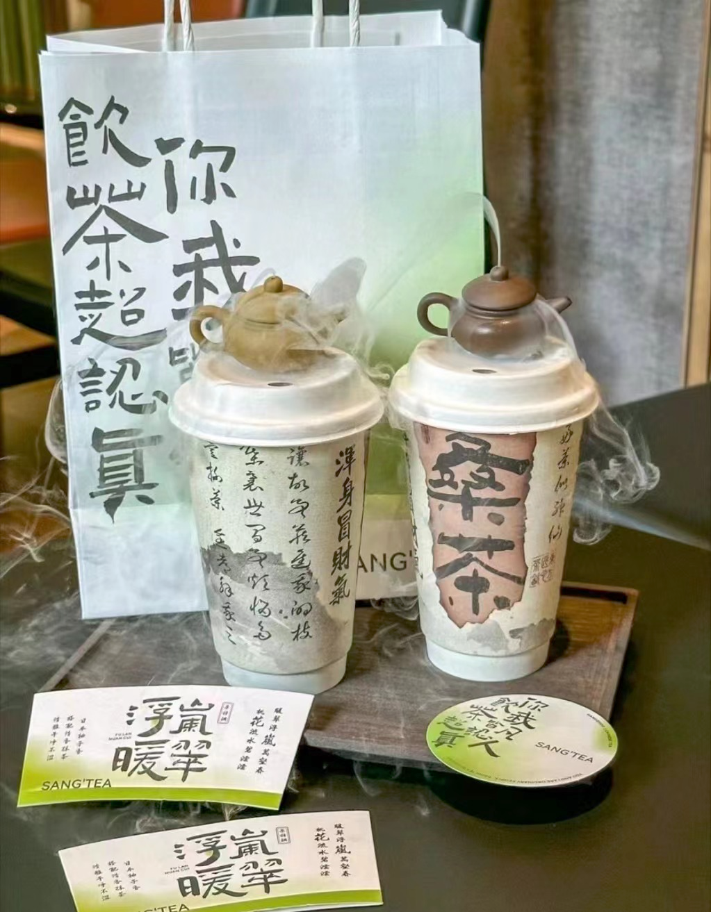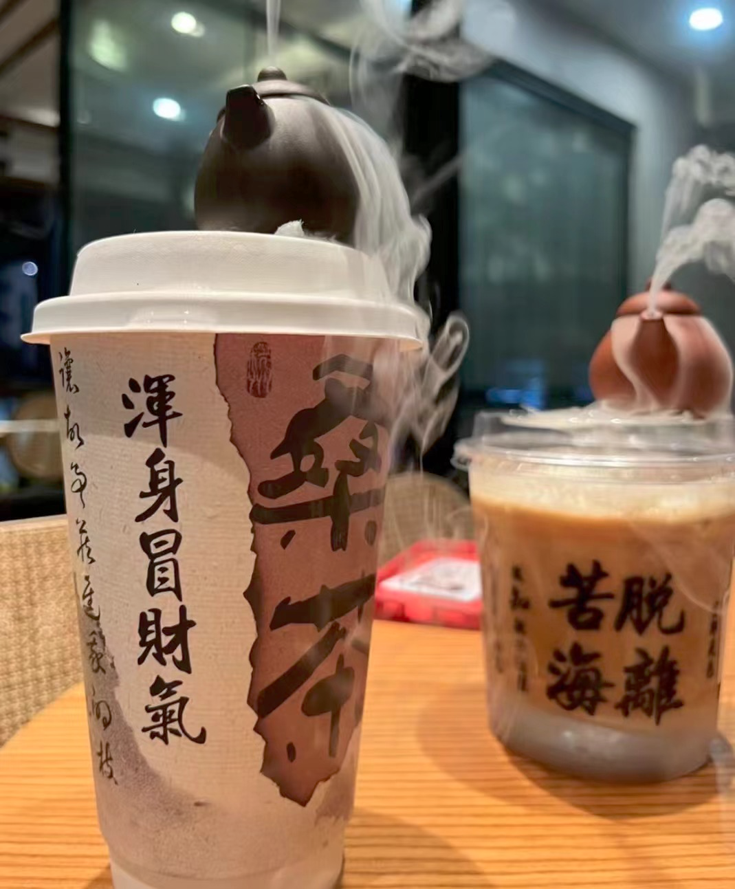纸杯上顶着一只小茶壶,里面放了干冰,不断冒“仙气”,寓意“浑身冒财气”。透明杯身上还写着“脱离苦海”、“碎碎浮生”、“无忧观音”……