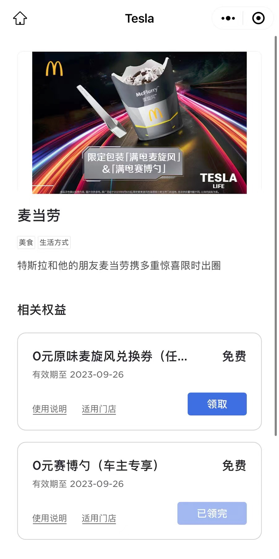 在特斯拉小程序中,车主可免费领麦旋风和勺子,不过现在勺子已经被领完了,想要的话只能在麦当劳花钱买了。