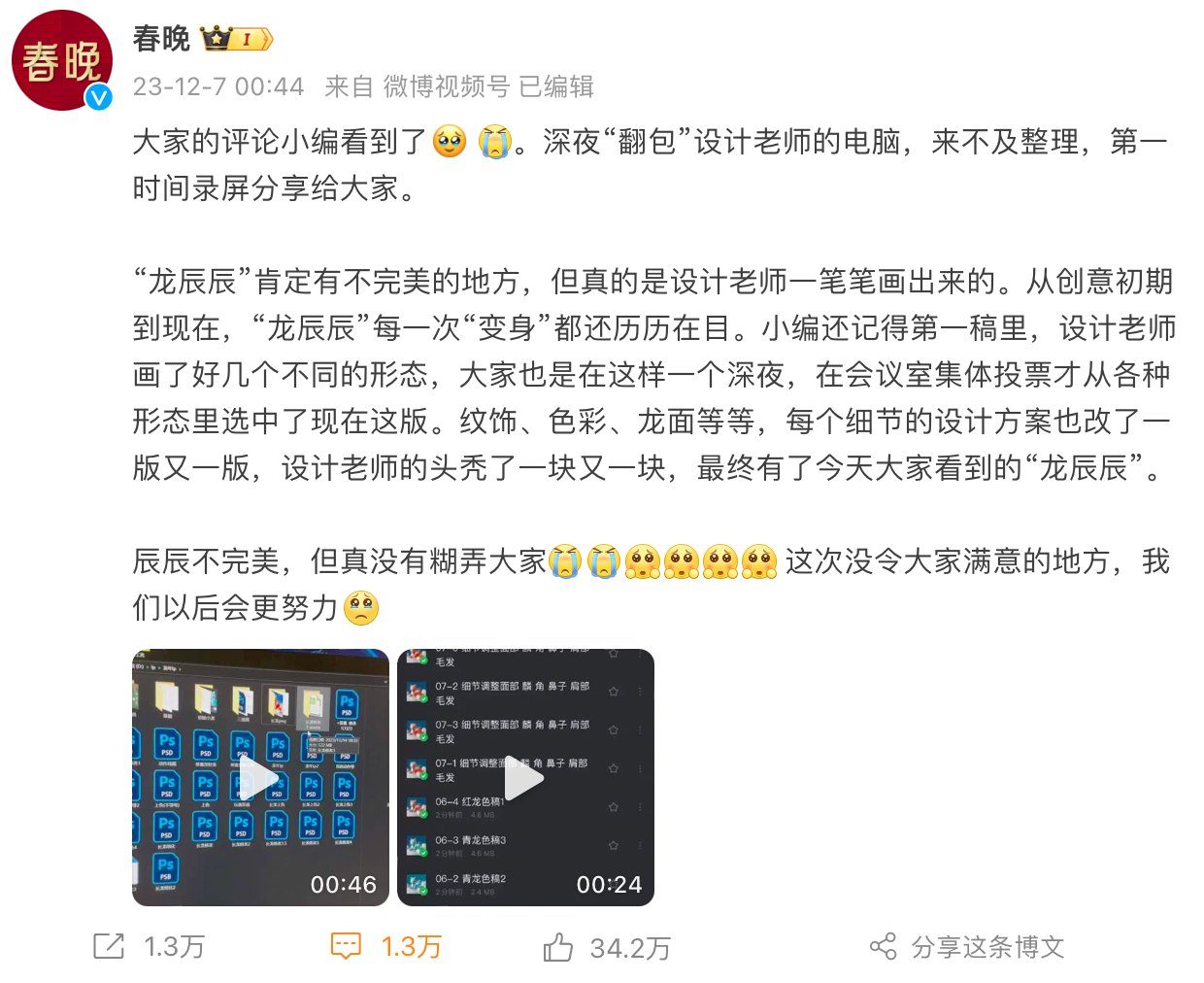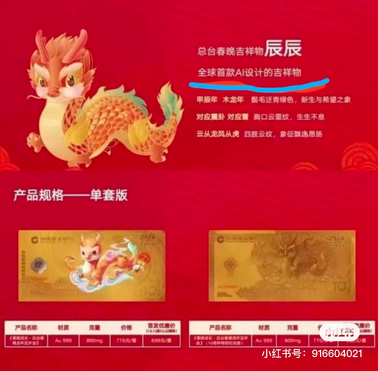 对于网友的质疑,官方也是坐不住了。春晚官方微博账号的小编连夜发博回复网友,录屏设计稿文件,证明“龙辰辰”是设计师一笔一笔画出来的。不过让网友感到奇怪的是,展示的设计文件实在太小,有些不合常理,官方也没有展示作画图层,不够有说服力……更加蹊跷的是,在中国建设银行新推出的“生肖龙年压岁金”宣传图上,明明白白写着春晚吉祥物辰辰,是“全球首款AI设计的吉祥物”。