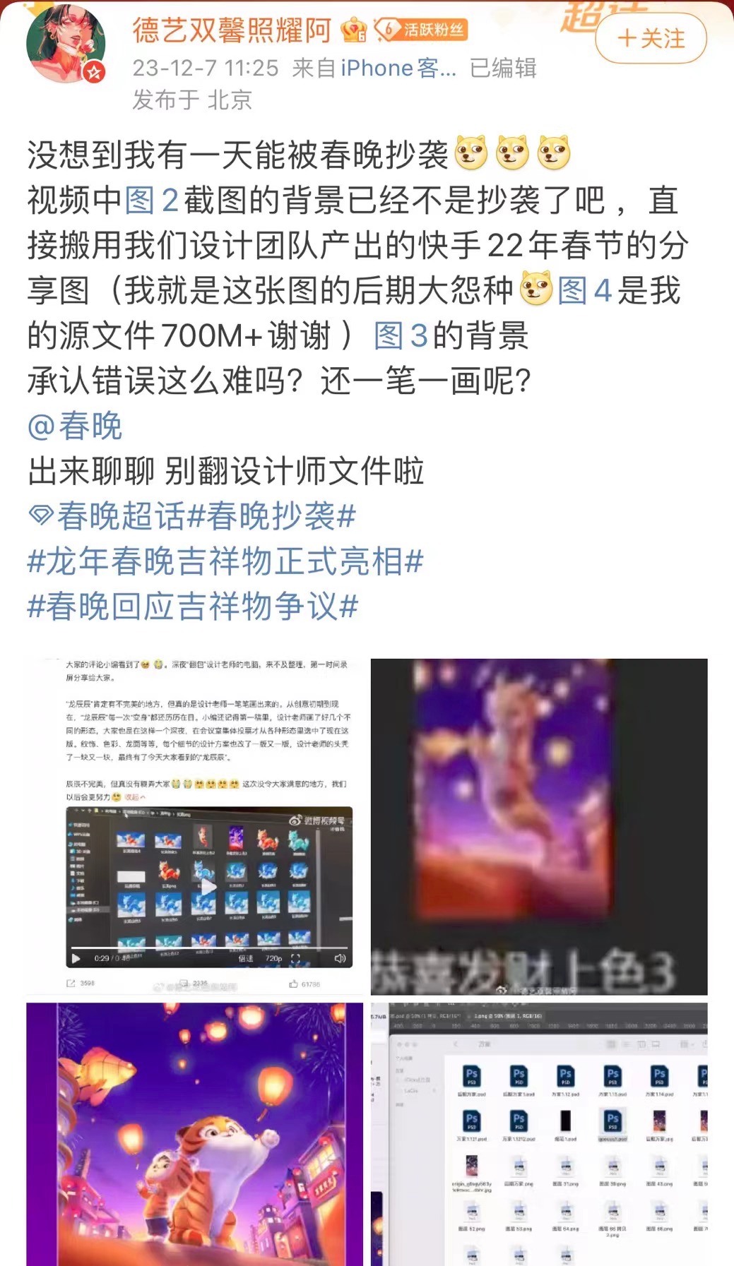 除了由“龙辰辰”引发的讨论,微博用户@德艺双馨照耀阿 更是从录屏中发现,自己的设计作品好像还被春晚抄袭了。