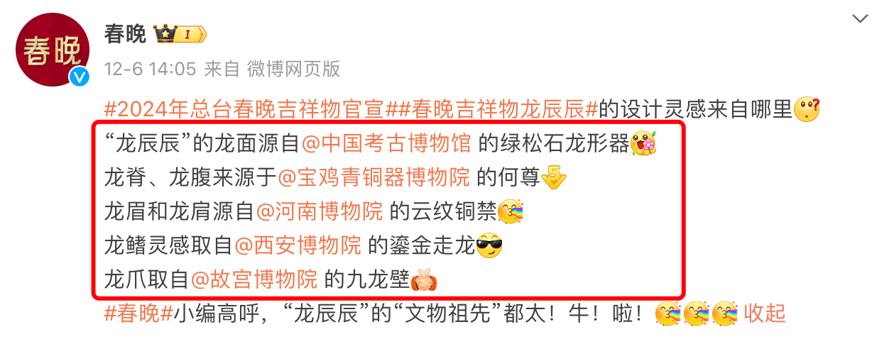 春晚吉祥物取名为“龙辰辰”,据春晚官方微博介绍,吉祥物身上各个部位的设计灵感分别来自不同年代的“龙”形文物。