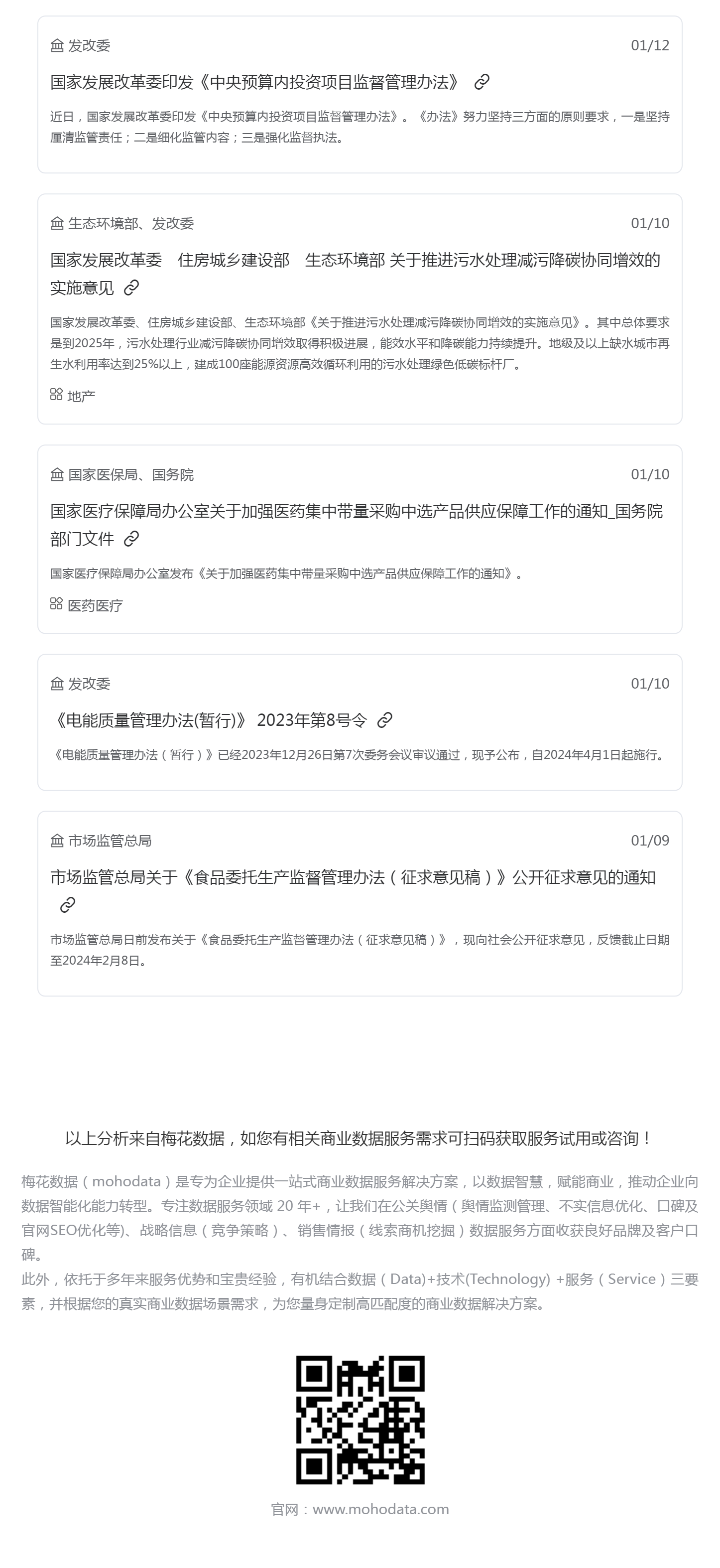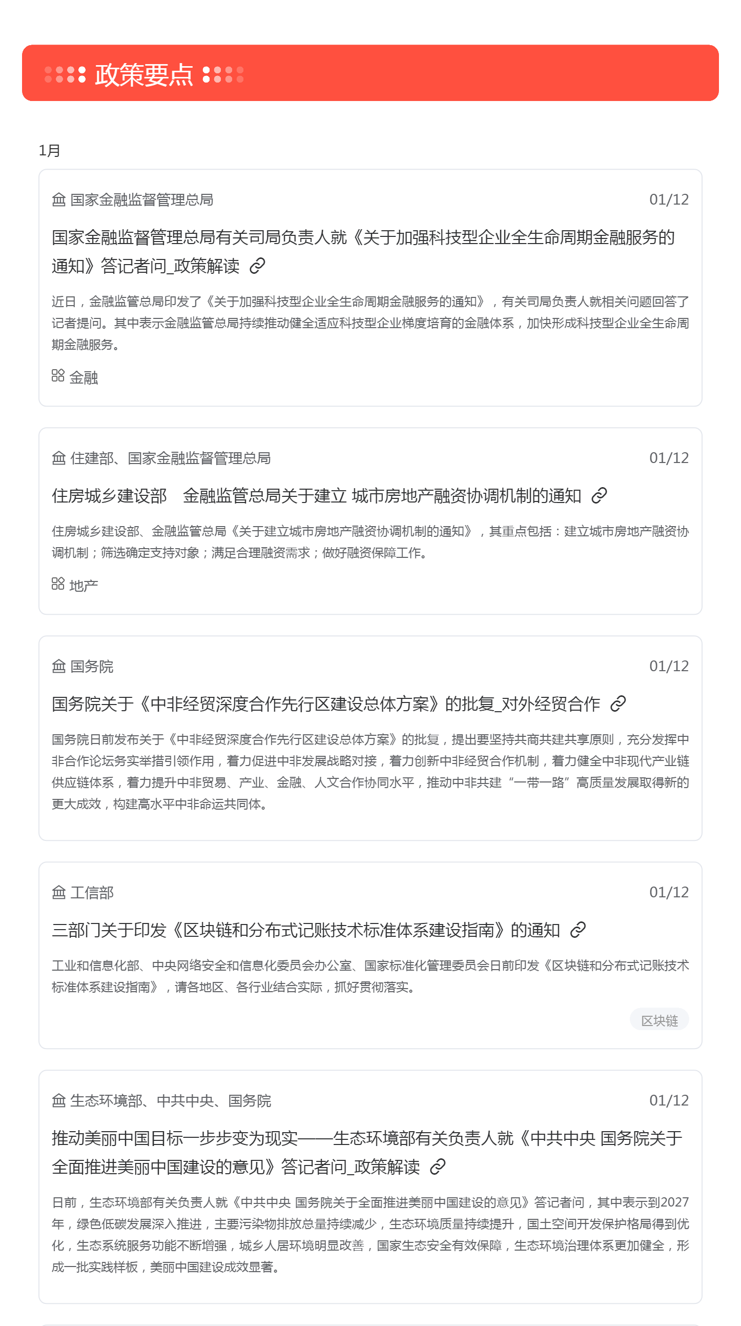根据梅花数据舆情监测要政盘点统计,上周共收录重要政策信息共计69条,其中涉及环保、金融、外贸等多个领域,建议重点关注《关于加强科技型企业全生命周期金融服务的通知》、《关于全面推进美丽中国建设的意见》答记者问_政策解读等政策。