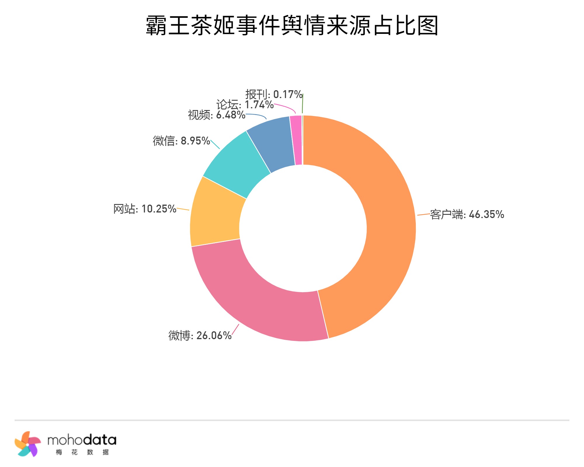 其中信息来源分布图如下图所示,声量主要集中在客户端,客户端占比46.35%,微博占比26.06%,网站10.25%,其他信息来源占比不超过10%。