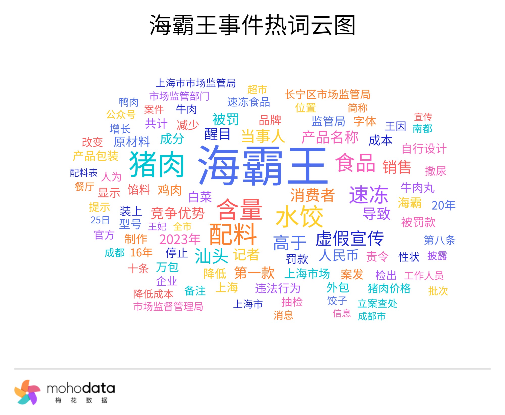 声量热词方面,热词云图如下所示,其中“配料”“含量”“速冻”“虚假宣传”“汕头”“当事人”“销售”“醒目”“被罚”“竞争优势”等词汇排名较前。