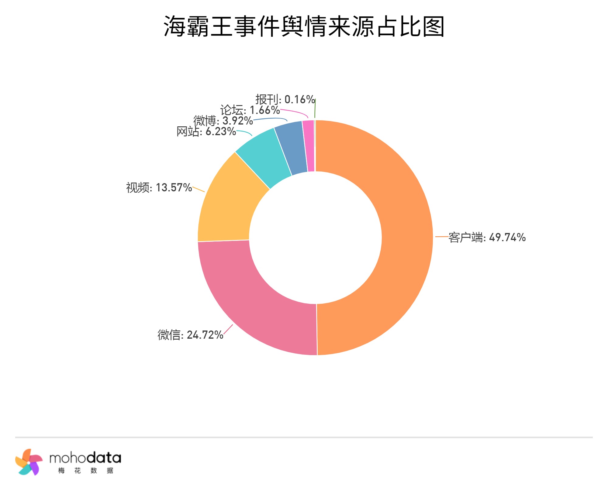 其中信息来源分布图如下图所示,声量主要集中在客户端,客户端占比49.74%,微信占比24.72%,视频占比13.57%,其他信息来源占比不超过10%。