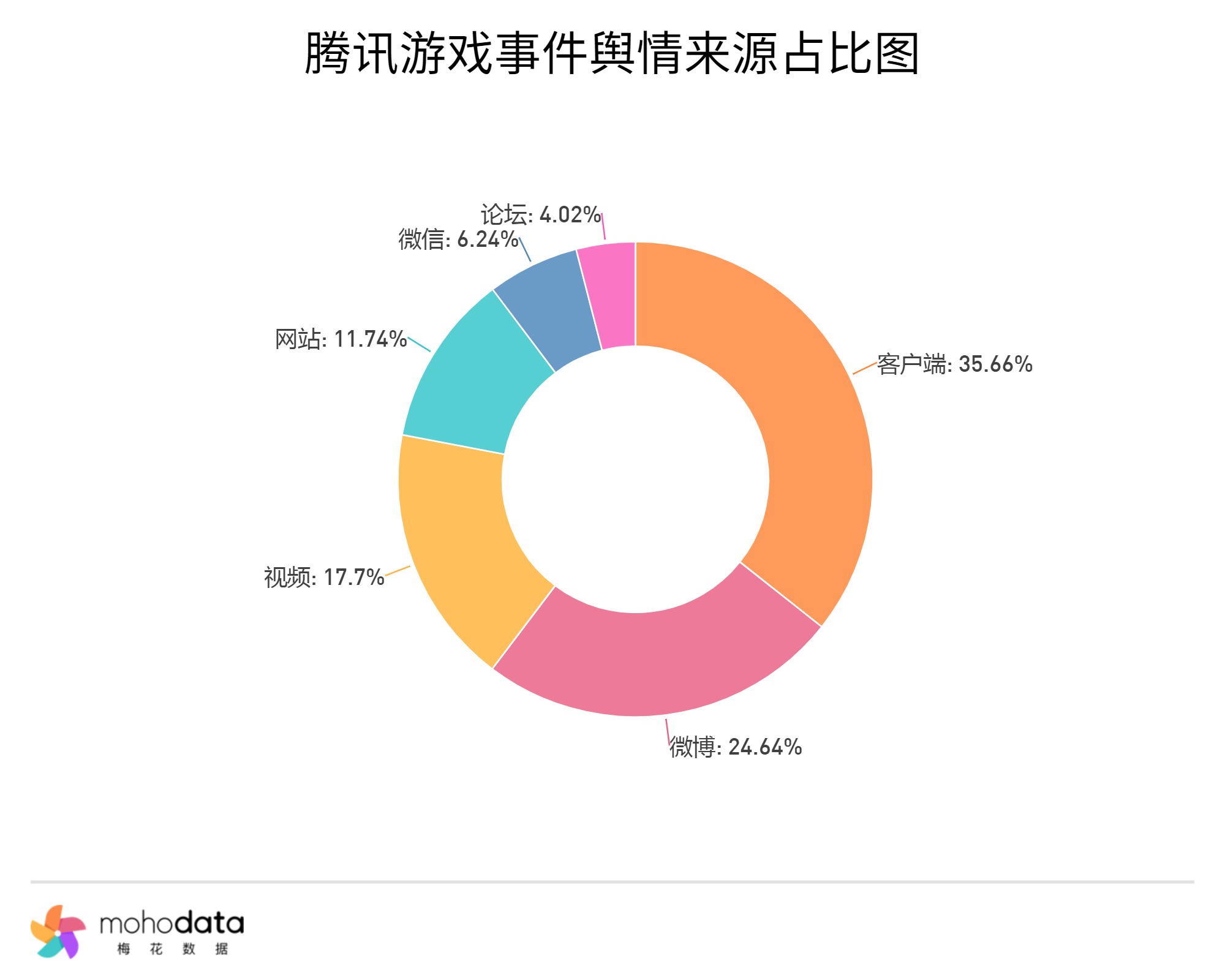 其中信息来源分布图如下图所示,声量主要集中在客户端,客户端占比35.66%,微博占比24.64%,视频占比17.70%,网站占比11.74%,其他信息来源占比不超过10%。