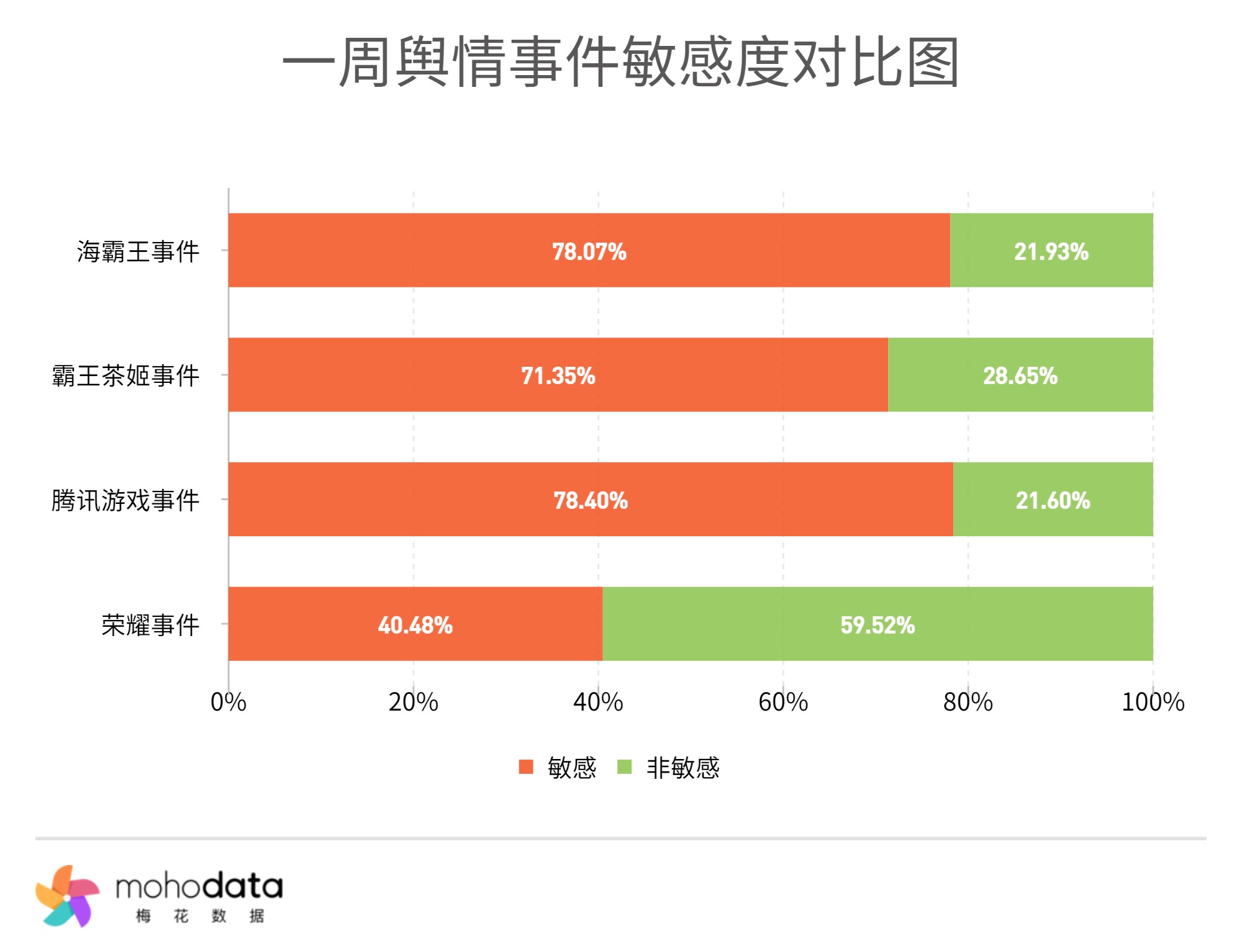 敏感度方面,“腾讯游戏事件”相关的敏感度最高,占比达78.40%,“海霸王事件”占比达78.07%, “霸王茶姬事件”占比达71.35%, “荣耀事件”占比达40.48%。