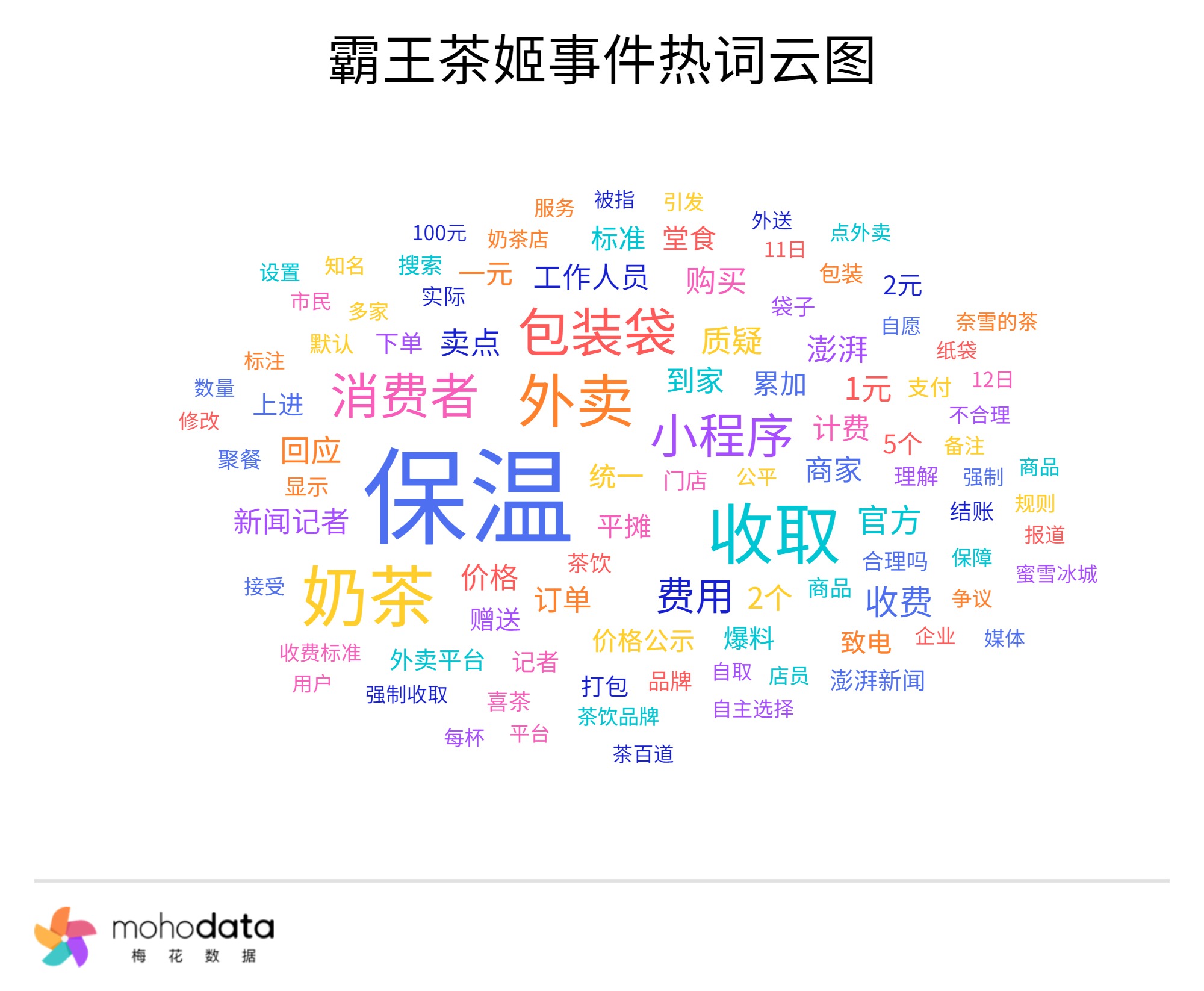 声量热词方面,热词云图如下所示,其中“保温”“收取”“包装袋”“费用”“质疑”“1元”“卖点”“商家”等词汇排名较前。