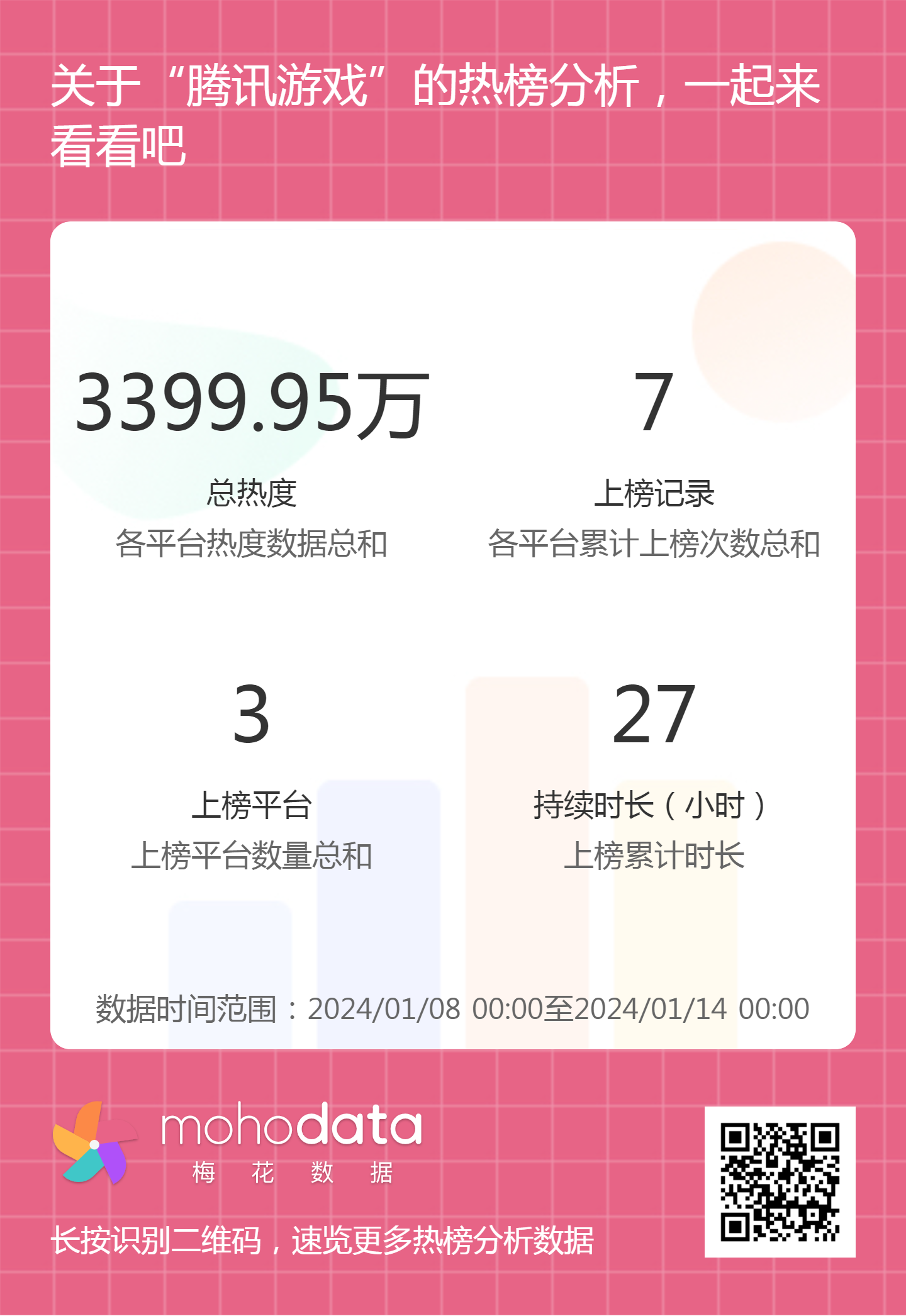 热搜方面,此次腾讯游戏事件相关热搜热度总计3399.95万,上榜记录7次,上榜平台3家,持续时长27小时。详情可扫描以下二维码查看。