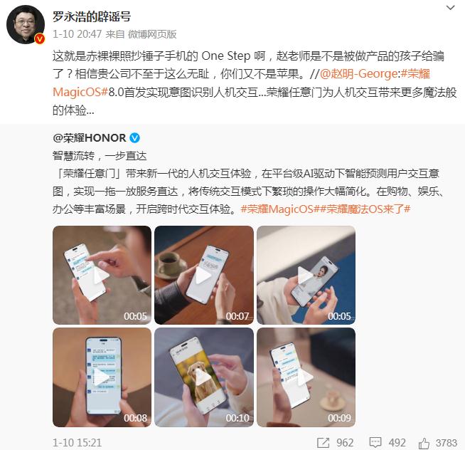 1月11日,荣耀的研发负责人邓斌接受采访时表示:“罗老师那个方式我们认为是一个可隐藏的快捷方式,而‘任意门’是荣耀独立研发的、基于意图识别的交互逻辑,在那个时代是完全没有的。”