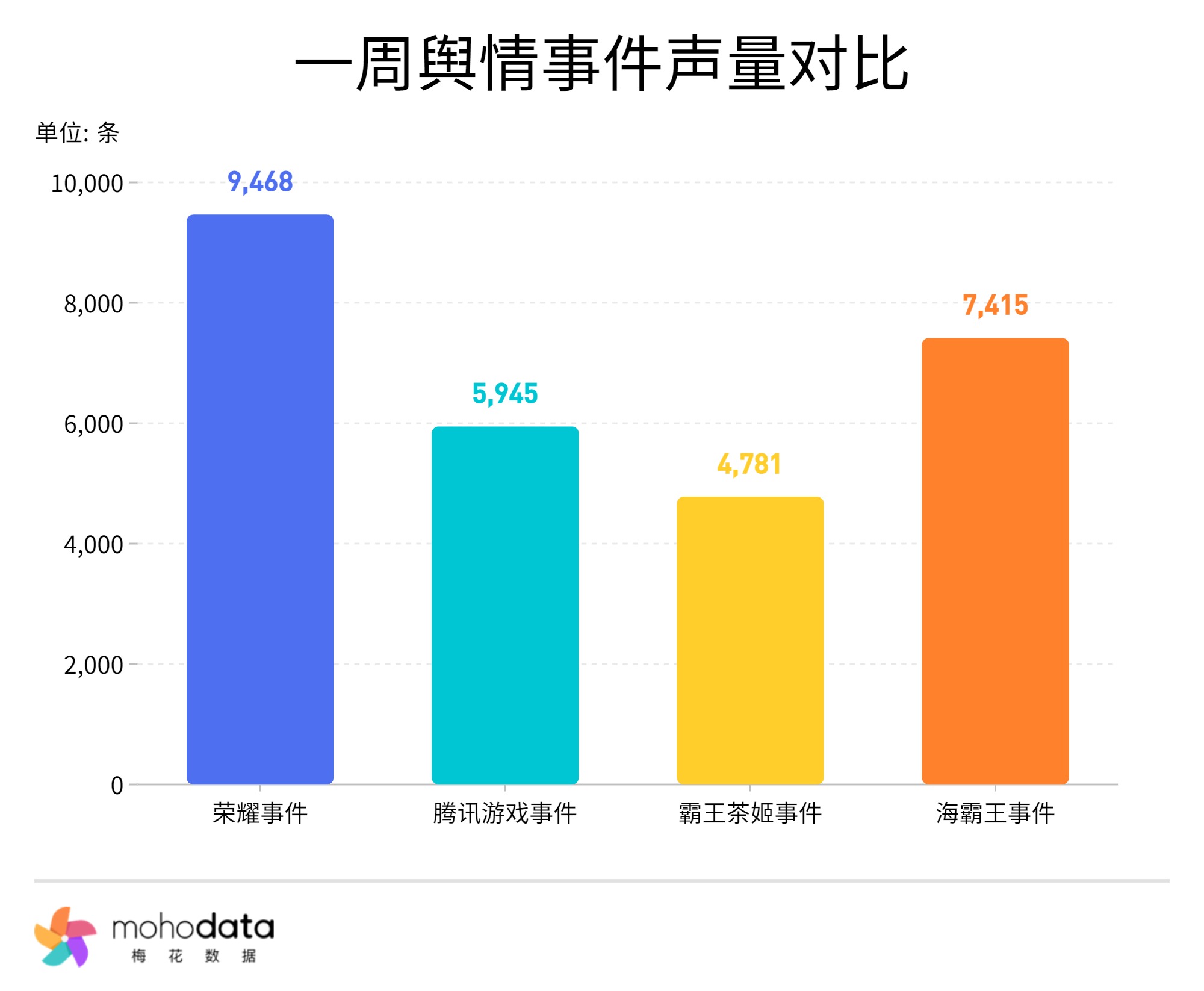 舆情声量方面,监测期间内主要舆情当中,“荣耀事件”声量最高,共监测到舆情声量9468条,其次“海霸王事件”舆情声量为7415条, “腾讯游戏事件”舆情声量为5945条,“霸王茶姬事件”舆情声量为4781条。