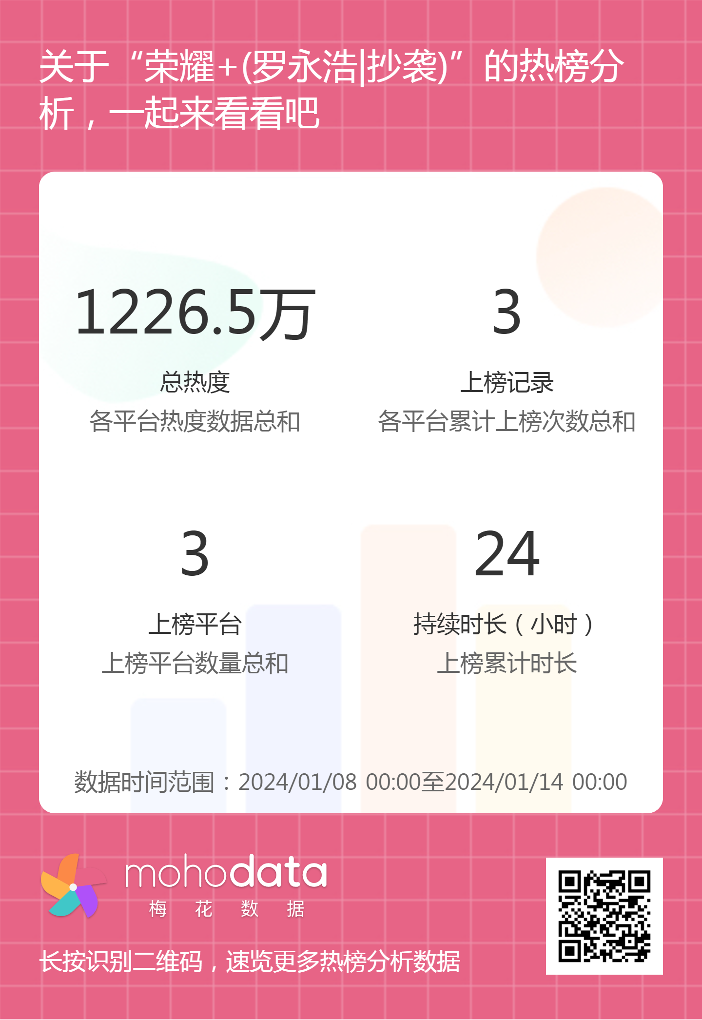热搜方面,此次荣耀事件相关热搜热度总计1226.5万,上榜记录3次,上榜平台3家,持续时长24小时。详情可扫描以下二维码查看。