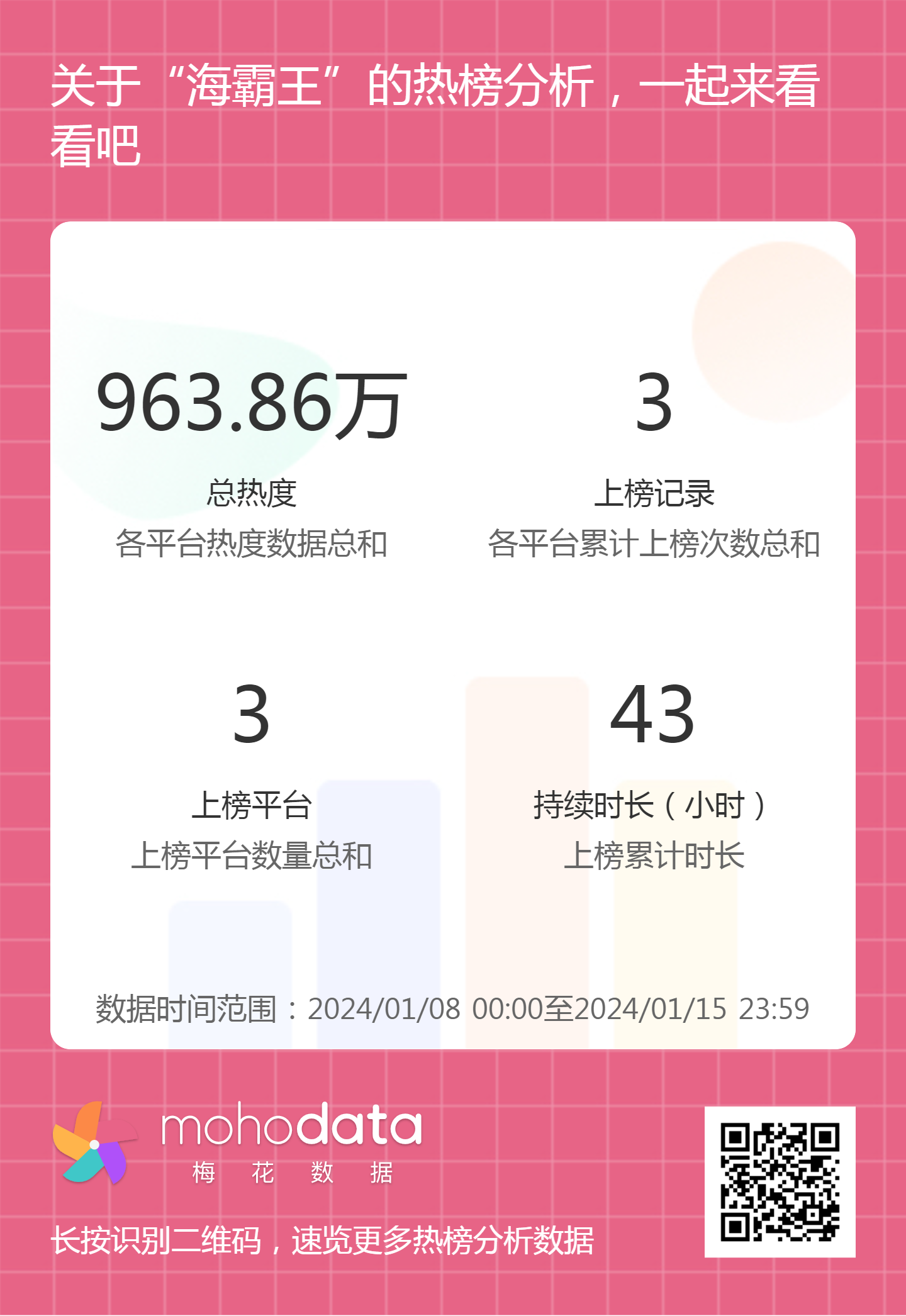 热搜方面,海霸王事件相关热搜热度总计963.86万,上榜记录3次,上榜平台3家,持续时长43小时。详情可扫描以下二维码查看。