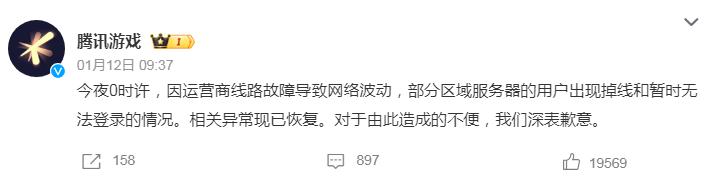 1月12日9点37分,腾讯游戏在微博进行回应:“今夜0时许,因运营商线路故障导致网络波动,部分区域服务器的用户出现掉线和暂时无法登录的情况。相关异常现已恢复。对于由此造成的不便,我们深表歉意。”