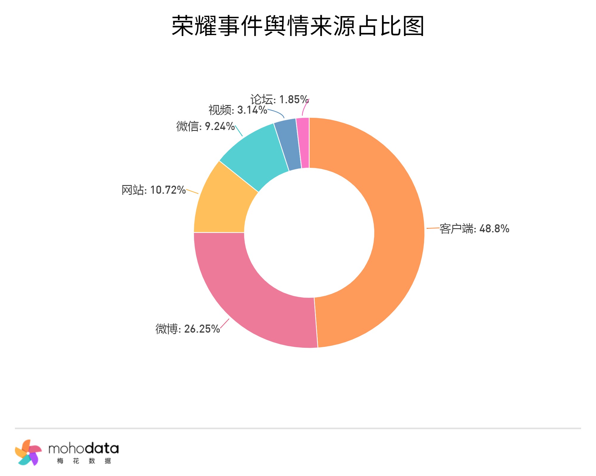 其中信息来源分布图如下图所示,声量主要集中在客户端,客户端占比48.80%,微博占比26.25%,网站占比10.72%,其他信息来源占比不超过10%。