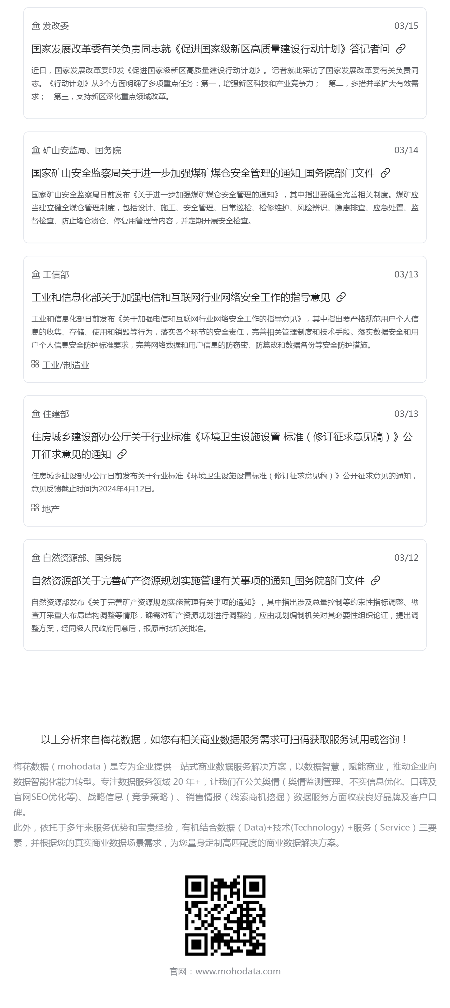 根据梅花数据舆情监测要政盘点统计,监测期间共收录重要政策信息共计82条,其中涉及环保、能源、金融、地产等多个领域,建议重点关注《关于加强生态环境分区管控的意见》、《促进国家级新区高质量建设行动计划》等政策。
