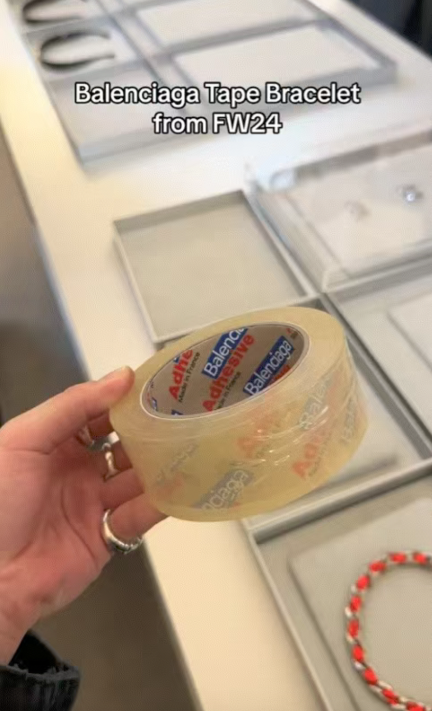 有网友展示了一款“手镯饰品”,看着像是快递纸箱的封箱胶带。据国外某媒体称,该巴黎世家胶带将以3000欧元的价格售卖。