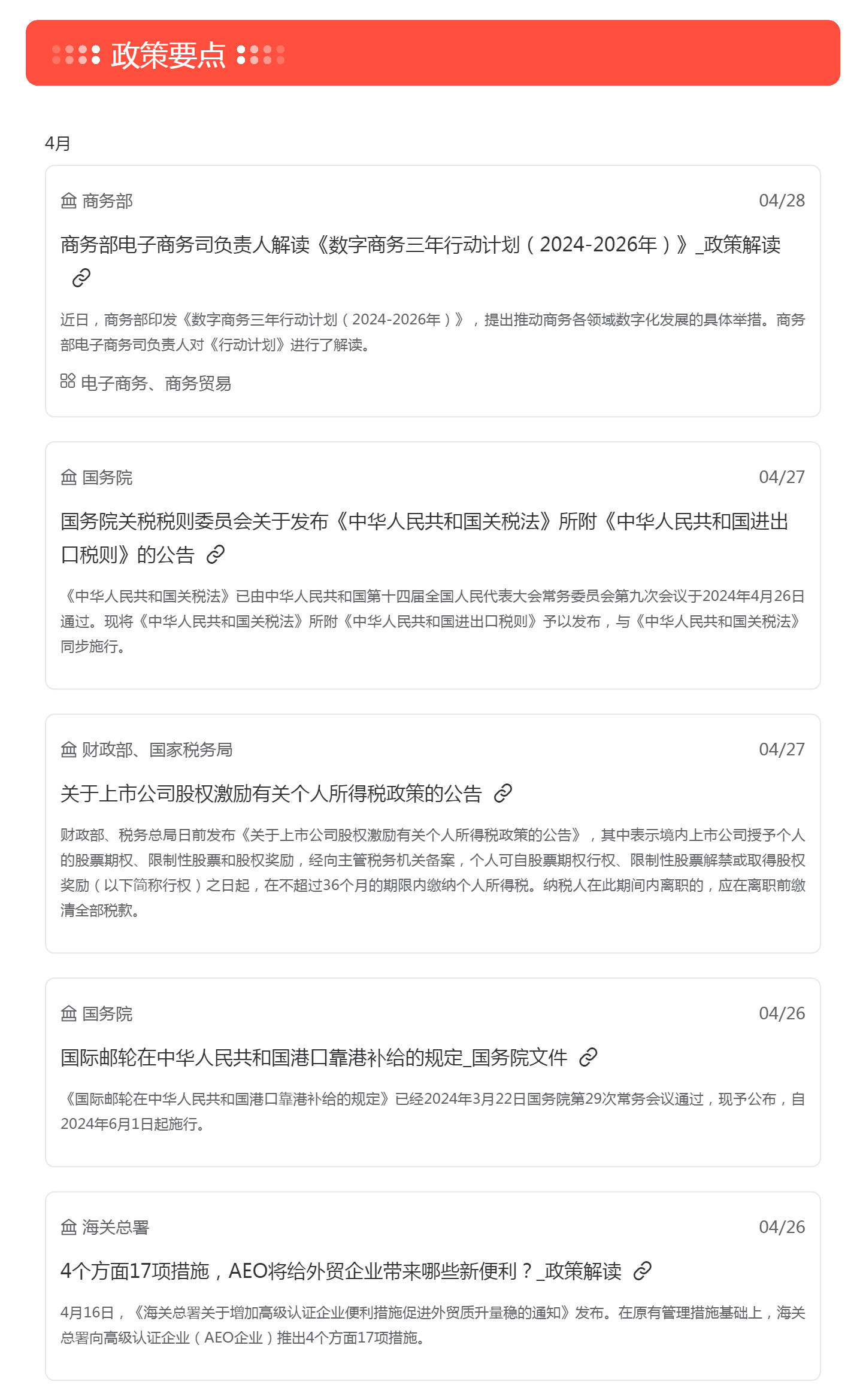 根据梅花数据舆情监测要政盘点统计,监测期间共收录重要政策信息共计69条,其中涉及进出口、地产、汽车等多个领域,建议重点关注《中华人民共和国进出口税则》、《汽车以旧换新补贴实施细则》等政策。