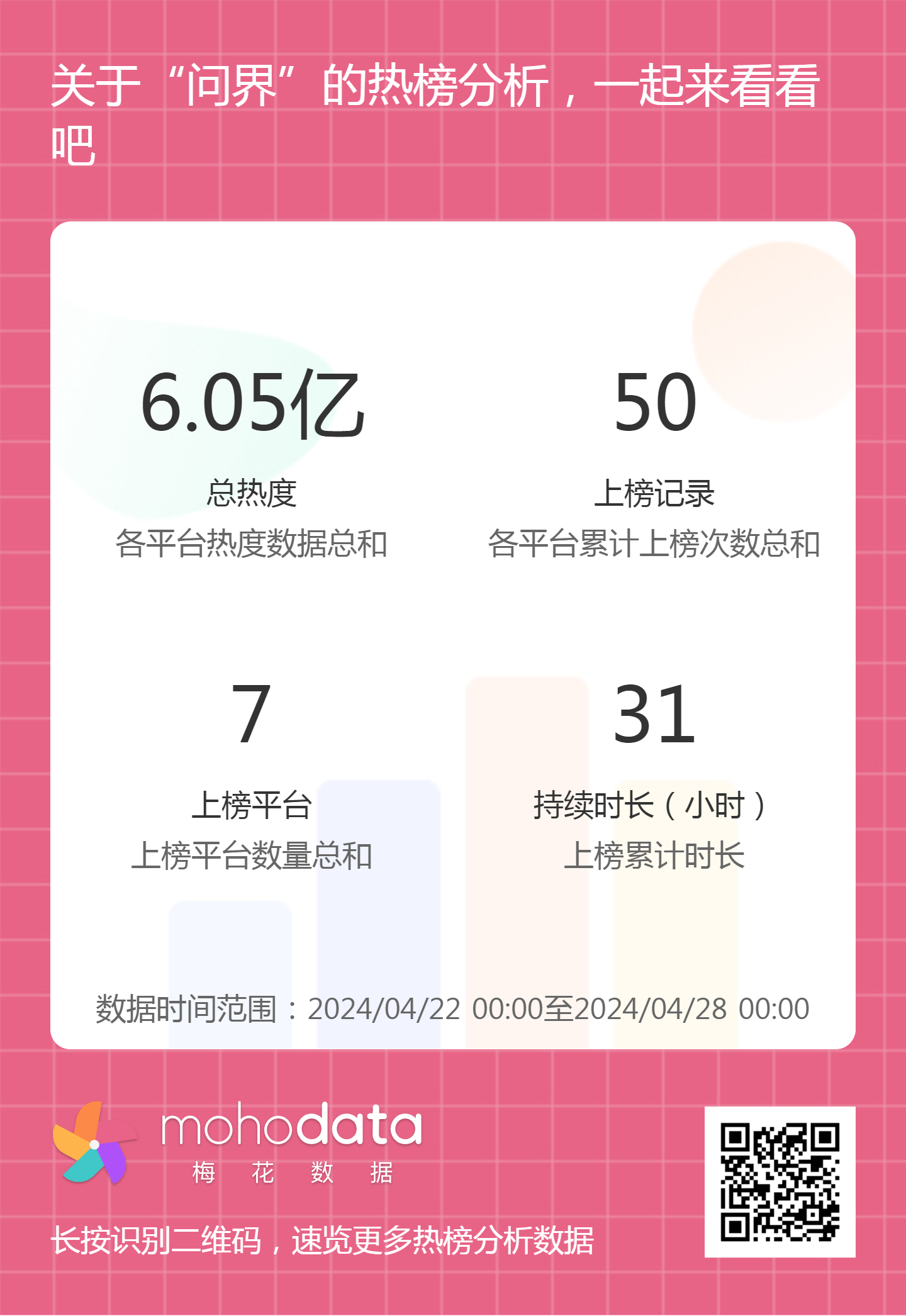 热搜方面,此次问界事件相关热搜热度总计6.05亿,上榜记录50次,上榜平台7家,持续时长31小时。详情可扫描以下二维码查看。