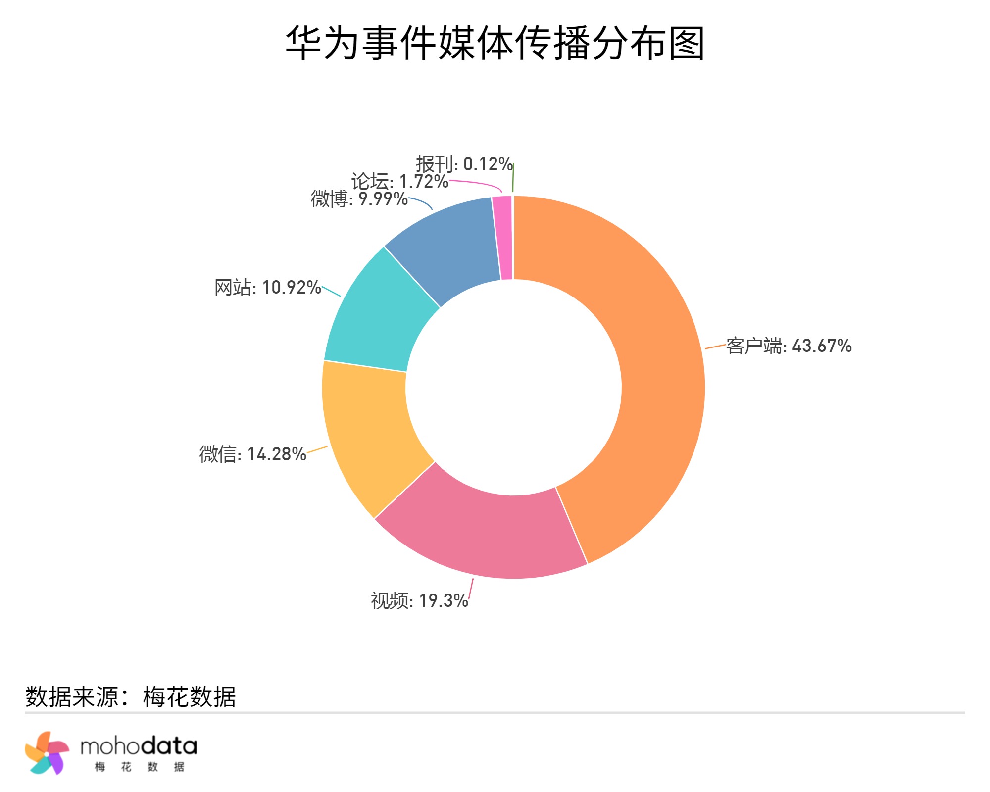 其中信息来源分布图如下图所示,声量主要集中在客户端,客户端占比43.67%,视频占比19.30%,微信占比14.28%,网站占比10.92%,其他信息来源占比不超过10%。