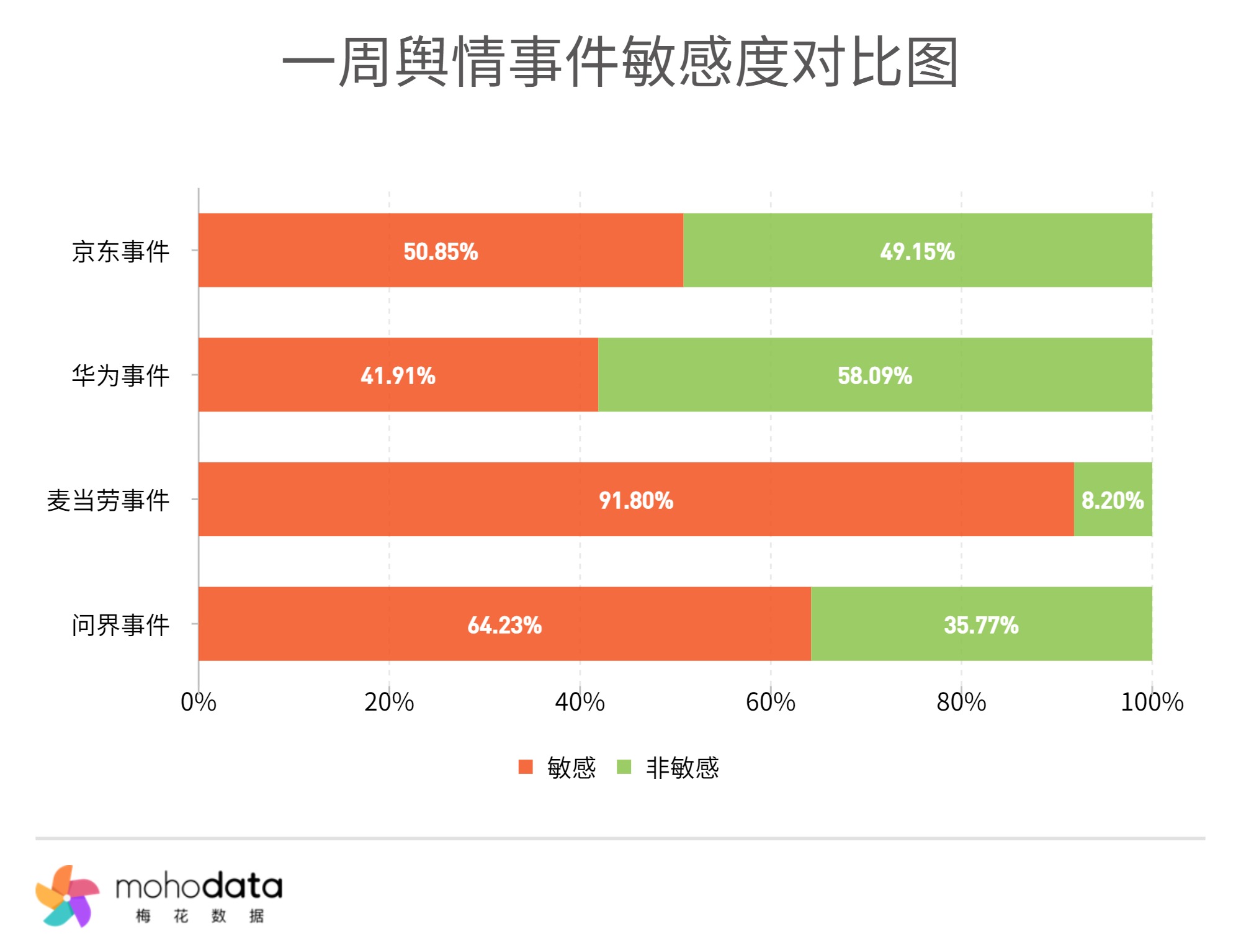 敏感度方面,“麦当劳事件”相关的敏感度最高,占比达91.80%,“问界事件”占比达64.23%, “京东事件”占比达50.85%, “华为事件”占比达41.91%。
