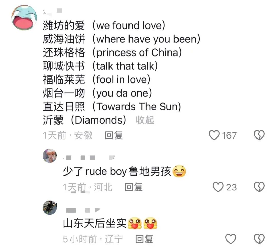 “山东天后”在上海滩摊煎饼果子什么的,场面真的有点魔幻好笑~(因多首歌曲被空耳成山东地名,Rihanna喜获“山东天后”之称。)有歌迷吐槽,从美妆到美食,除了发歌,啥都干。