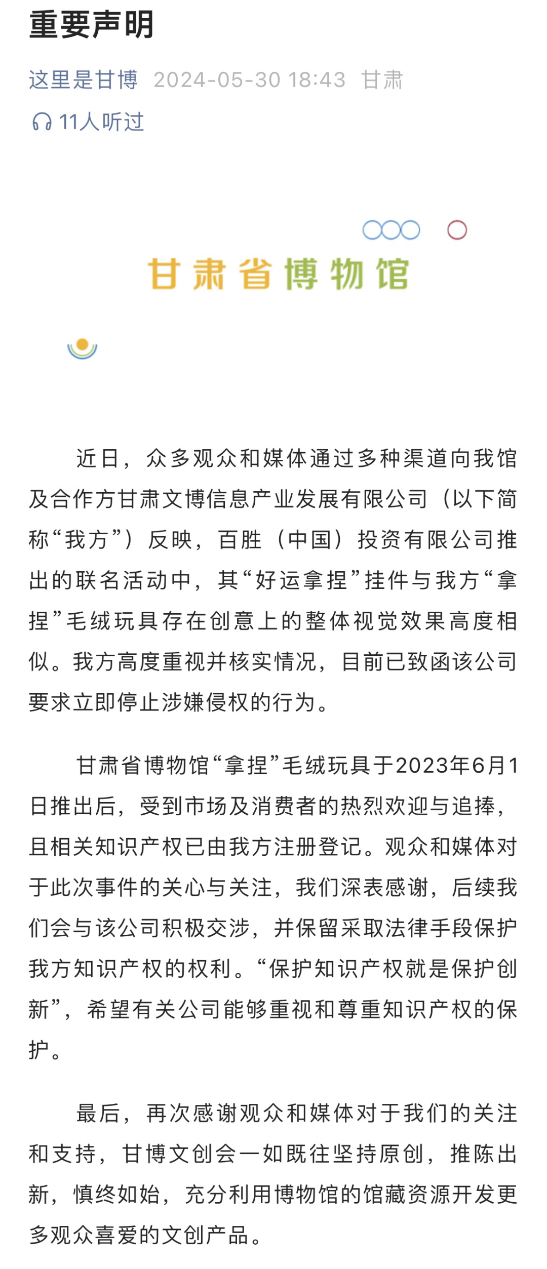 然而,就在5月30日,甘肃省博物馆官方在多个平台发表声明,称必胜客的“好运拿捏”挂件与甘博在2023年6月1日推出的“拿捏”毛绒玩具存在创意上的整体视觉效果高度相似,甘博要求必胜客方停止抄袭侵权行为。