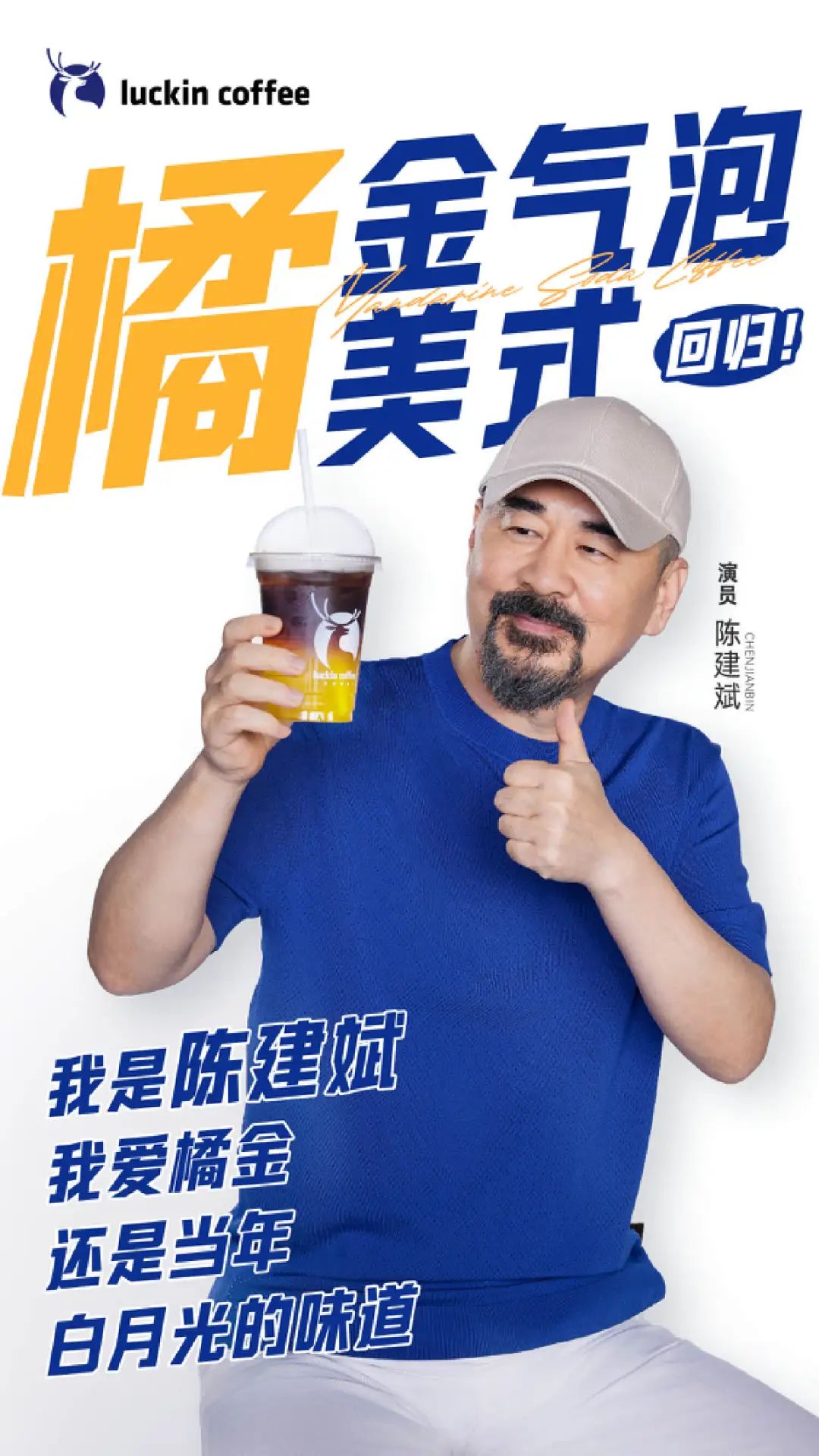 近日,瑞幸咖啡官宣一款特调咖啡饮品“橘金气泡美式”回归。品牌方邀请到演员陈建斌为其拍摄宣传短片。陈建斌因在电视剧《甄嬛传》中饰演皇上一角,剧中常穿橘色衣服,胖胖懒懒不怎么动,好像一只胖橘猫,于是被网友亲切称呼为“大橘”。靠这一个“橘”字,产品和人就联系上了~