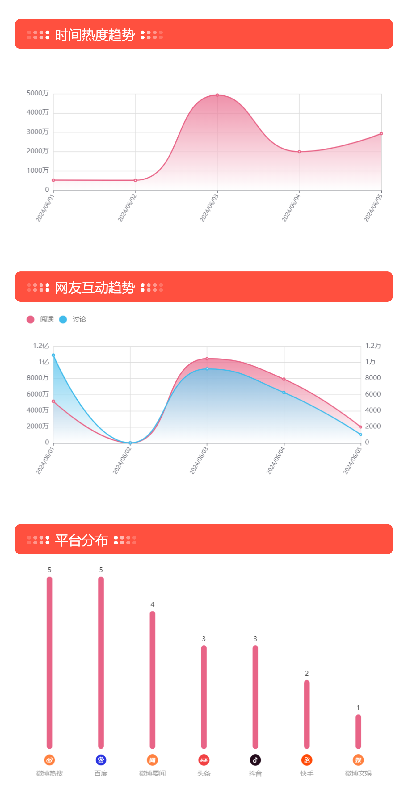 根据梅花数据热榜舆情监测,自6月1日至5日10时,全网各平台相关热搜共计23条,总热度达到8798.44万,上榜平台7家,上榜总持续时长达93小时。